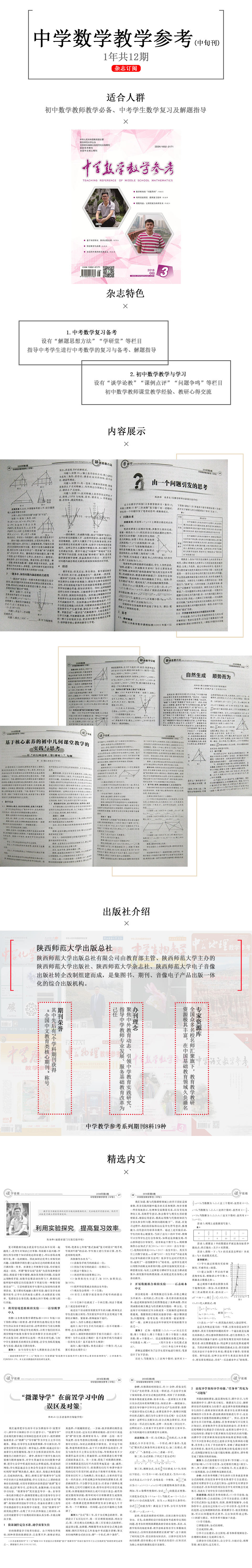 《中学数学教学参考》杂志创刊于1972年。在全国“中学数学”杂志中,它的创刊时间虽不是最早,但连续出刊的时间最长。目前,其内文容量最大(大16开本,72页),年出刊最多(36期),发行量在同类刊物中名列前茅。长期以来,它始终坚持 “真诚地为中学数学教学服务,为中学数学教师的专业化水平提升服务” 的办刊宗旨,杂志内容“求新(意)、求实(用)、求特(色)、求识(见)”,尤其在当前新课程改革中,已成为我国中学数学教育领域的专业主流媒体。