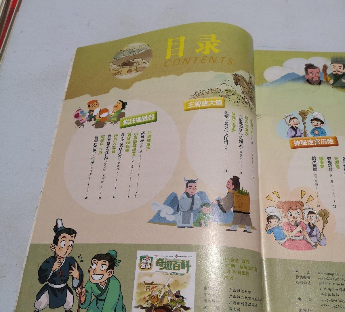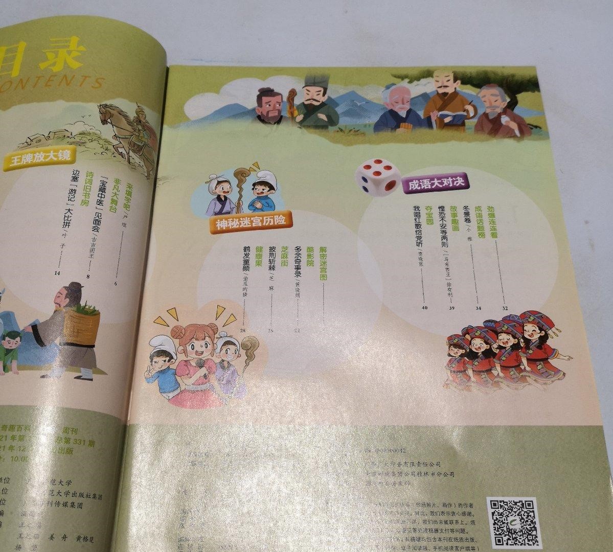 全刊栏目丰富,趣味性强。《诗词旧书房》带领小读者化身诗词达人,去古诗词中畅游一番,同时讲解、运用小学生常用的成语,帮助小读者积累和学习成语;《妙妙大本营》有小读者和传统文化不得不说的故事,学校、班级、家庭和小读者可以尽情在传统文化活动中展示风采;《新语直播间》带领小读者“连线”《世说新语》里古代“主播”,阅读古人的传奇经历,学习中国古代传统美德,同时积累学习成语、多视角学习小古文……通过形式丰富的故事、游戏来讲成语、学成语,但同时,还带着孩子们学习中国传统文化知识、学习诗词和小古文、甚至还有天文地理、自然、健康方面的知识,真是包罗万象,但又“万变不离成语”。