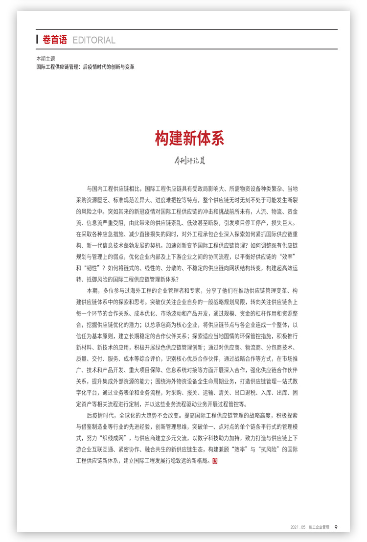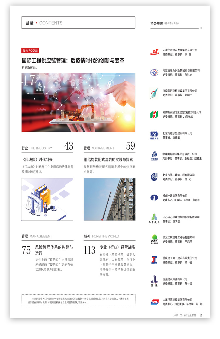 《施工企业管理》杂志办刊24年来,根植于广大施工企业,在传承风格中与时俱进,注重挖掘行业热点、难点问题;注重对企业管理实践进行深度剖析;注重对国内外施工企业前沿管理理念与趋势进行前瞻性介绍。杂志聚集了一大批行业研究、企业管理方面的专家,拥有一大批高素质、高水准、高品位的读者群。