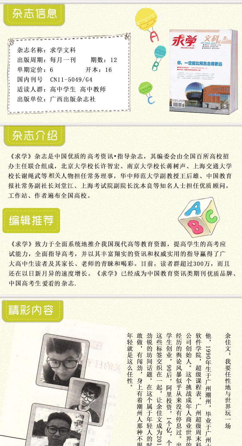 《求学》杂志是中国第一本高考资讯•指导杂志,其编委会由全国百所高校招办主任联合组成,北京大学校长许智宏、南京大学校长蒋树声、上海交通大学校长谢绳武等顶级人物担任常务理事,华中师范大学副教授王后雄、中国教育报社常务副社长刘堂江、上海考试院副院长沈本良等知名人士担任资深顾问,工作站、作者遍布全国高校。《求学》致力于全面系统地推介我国现代高等教育资源,提高学生的高考应试能力,全面指导高考,并以其丰富翔实的资讯和权威实用的指导赢得了广大高中生读者及其家长、老师的青睐和喝彩。目前,读者群超过300万,而且还在以日新月异的速度增长。《求学》已经成为中国教育资讯类期刊第一品牌、中国高考生的首选杂志。