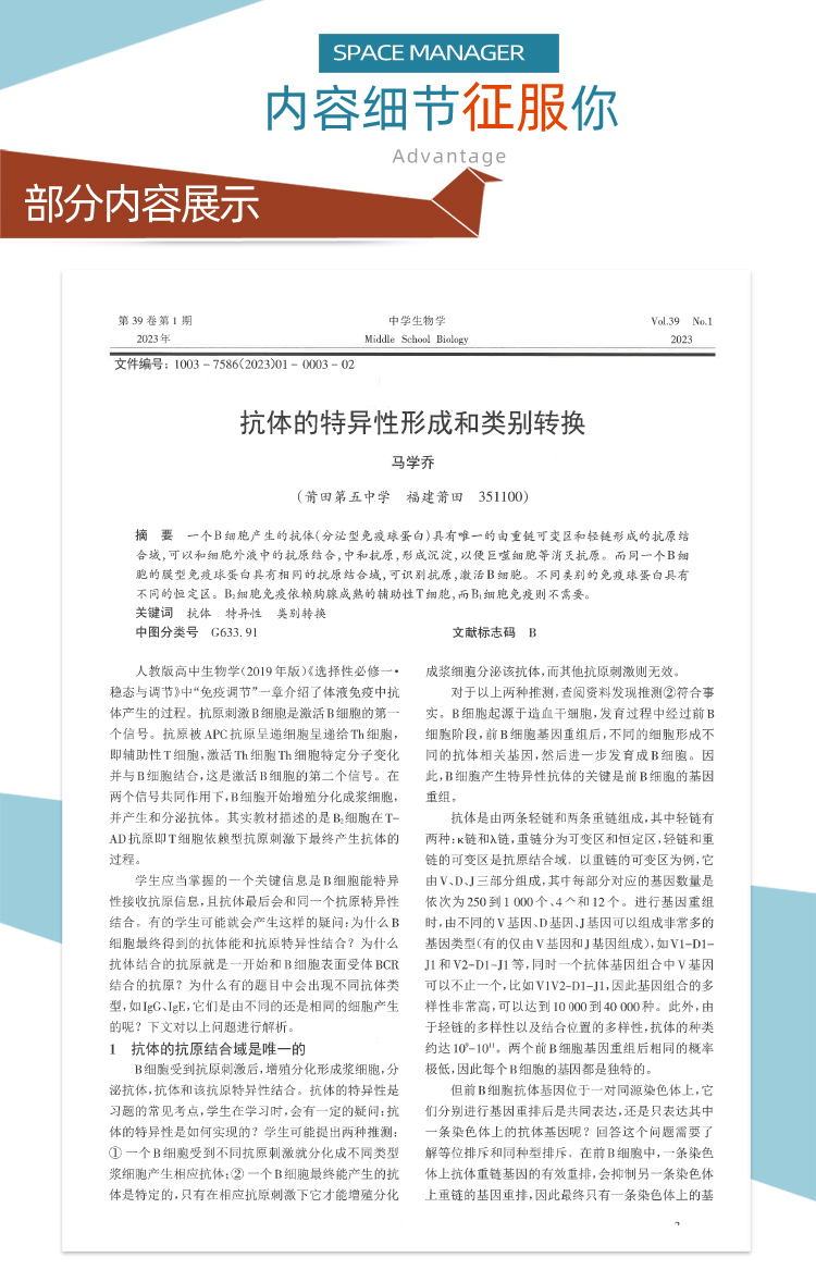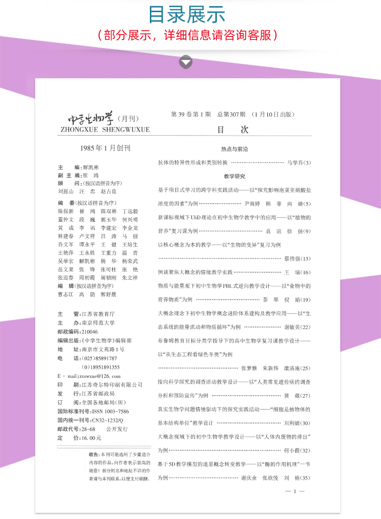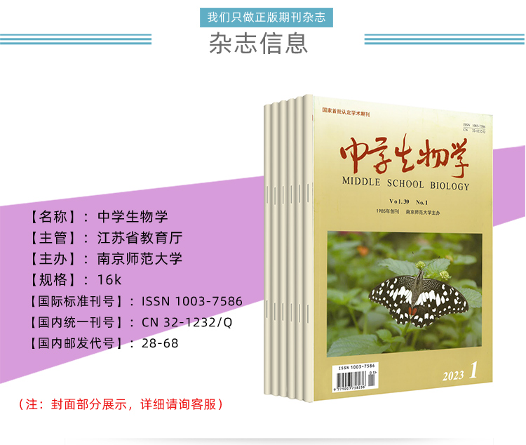 《中学生物学》主要报道中学生物学教育改革和提高中学生物课教学质量的经验。紧密结合中学生物学教学实际,帮助解决教和学中的疑难问题,丰富中学生的生物学知识。