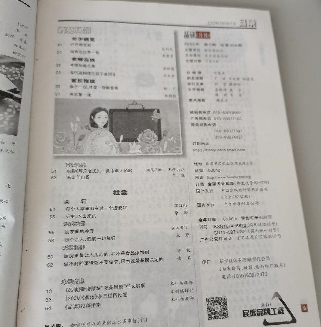 《品读》是半月谈杂志社主办、新华通讯社唯一的文摘期刊。她的前身是被誉为“小百科全书”的全国十佳文摘期刊《资料卡片杂志》。更名后她如同经历了一次凤凰涅槃,呈现给读者一片诗意葱茏的新天地。