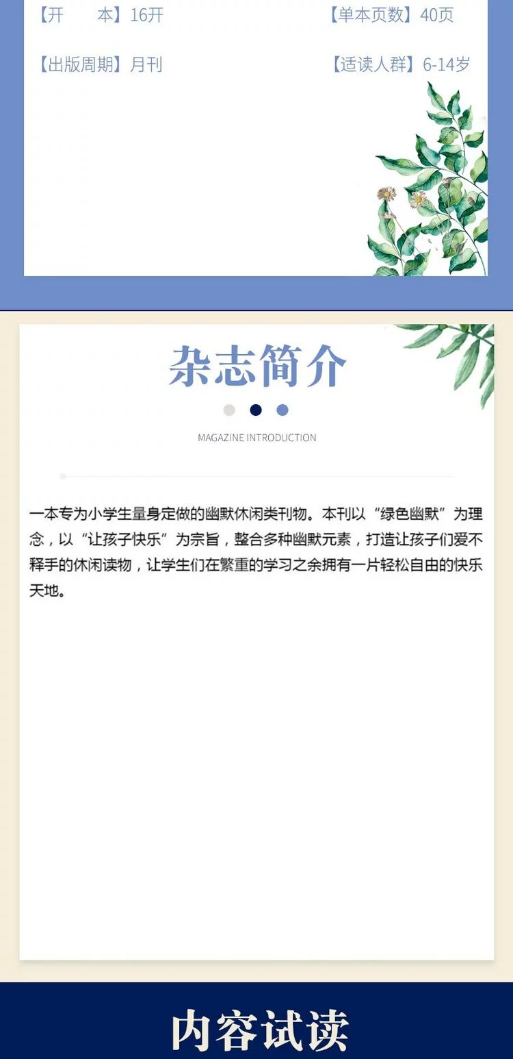 《幽默大王》杂志是专为小学生量身定做的幽默休闲类刊物。本刊以“绿色幽默”为理念,以“让孩子快乐”为宗旨,整合多种幽默元素,打造让孩子们爱不释手的休闲读物,让学生们在繁重的学习之余拥有一片轻松自由的快乐天地。 让孩子看一些笑话、学一点幽默,不仅能给他们带来心情的快乐,而且会在不知不觉中培养孩子的幽默感,使他/她的性格变得积极乐观,面对逆境更加坚强。