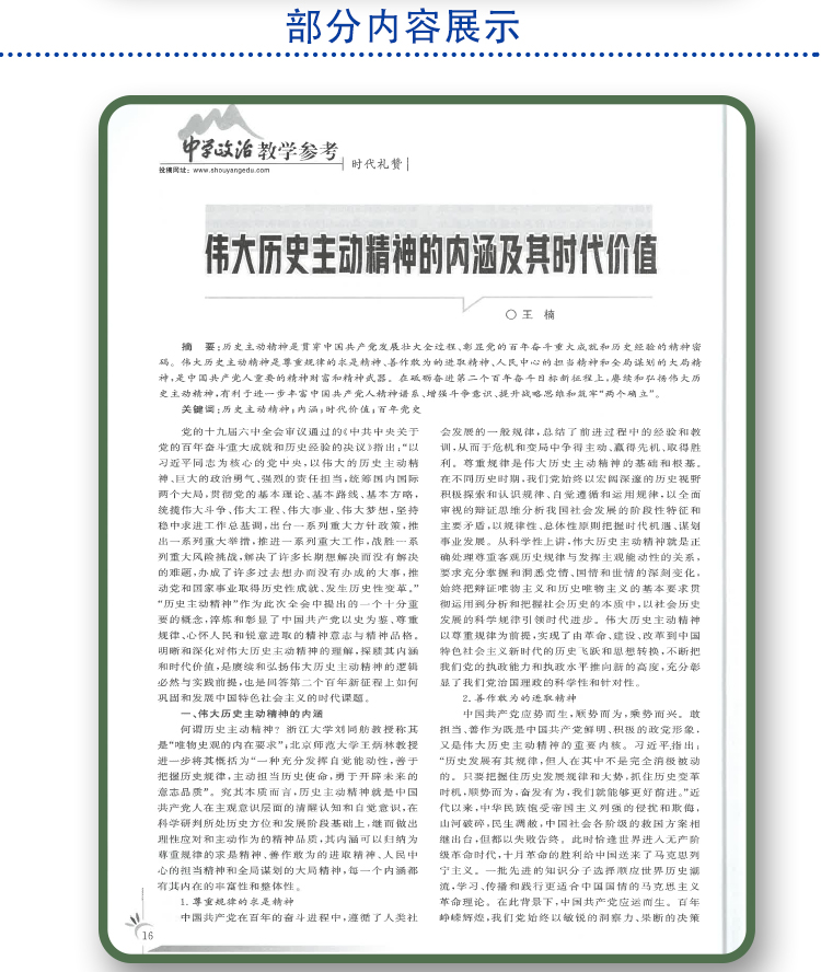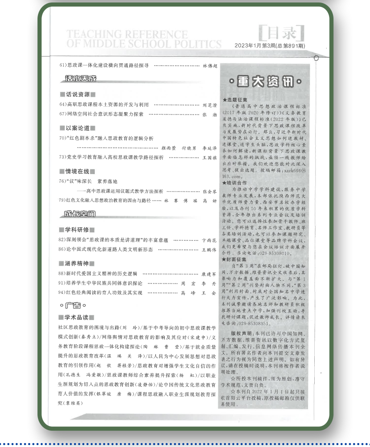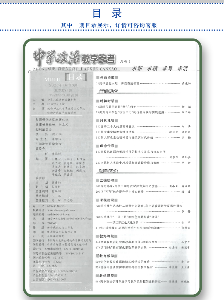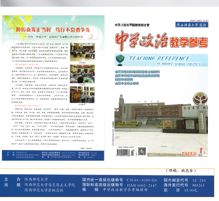 《中学政治教学参考》(中旬 初中)中旬刊为思想品德课教学的时代性、有效性、生成性、引领性、持续性提供优质、专业、集成、快捷的内容服务。切实贯彻服务教师、服务教学、服务考试的要求,真正做到把脉社会热点,引领课程改革,助推教学革新,关注升学考试,提升专业素养,反映教师诉求,培育学科名师。