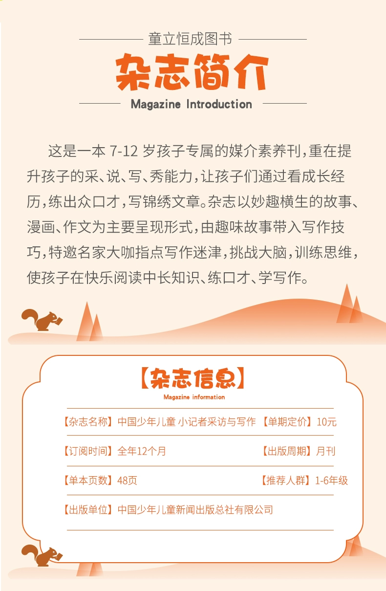 中旬刊为小记者采访与写作版(写作篇),它是小记者体验成功的乐园,小学生快乐作文的指南,少先队员展示才艺的舞台。