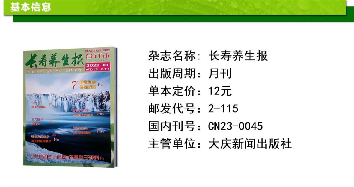 《长寿养生报·合订本》中老年健康养生领袖刊物,核心医药文化、多层次健康需求、多视角养生理念,多频段益寿探索,科学、权威、实用。