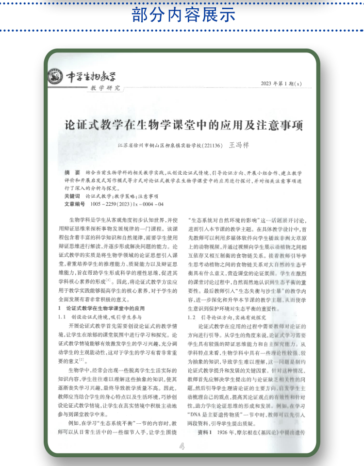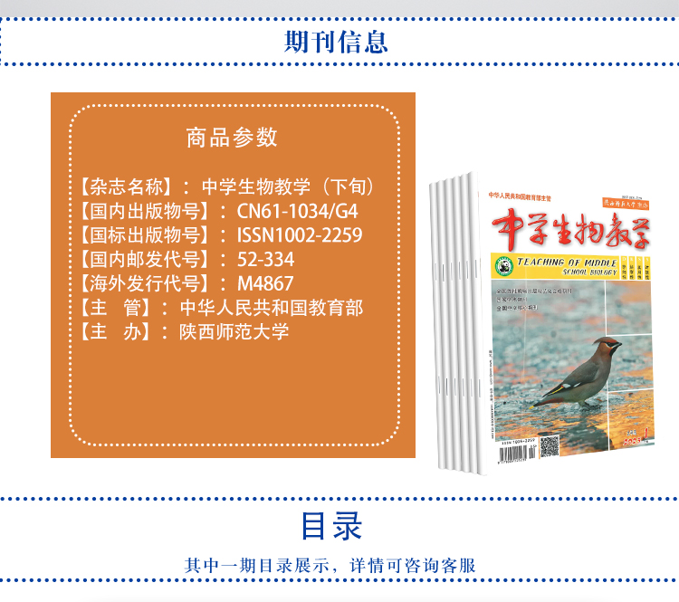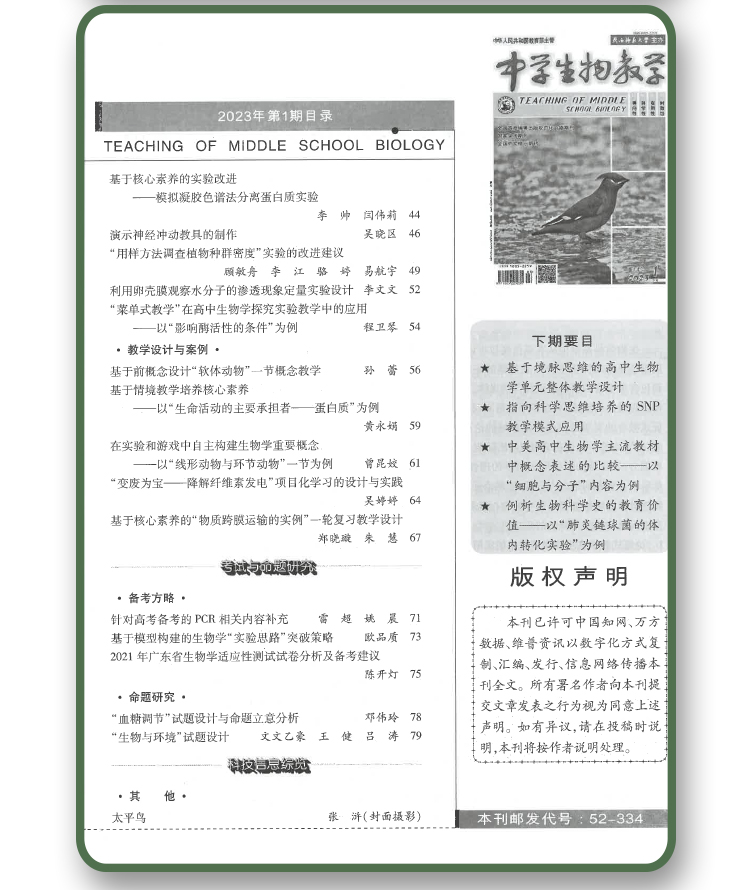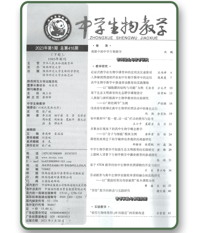 《中学生物教学》杂志是由中华人民共和国教育部主管、陕西师范大学主办的一份中等教育类教学期刊。自创刊以来,始终秉承为中学生物教学服务、为提高中学生物教师的专业化水平服务的办刊宗旨,坚持导向性、科学性、实用性和时效性的办刊方针,立足于基础教育改革前沿,兼顾教育理论的探索与应用研究,倡导学术争鸣与创新实践,注重新课程资源的开发与考试评价的研究,全方位展示基础教育改革的进程,为指导和提高中学生物教学质量,促进生物教学改革,全面推进素质教育发挥了巨大的作用。