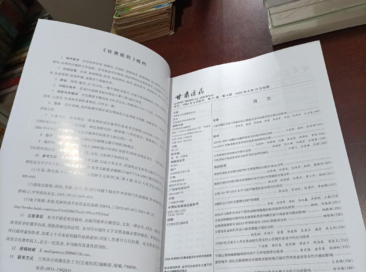《甘肃医药》(月刊)创刊于1982年,是由甘肃省医学科学研究院主办的医学性杂志。始终贯彻党和国家的医药卫生工作方针和出版方针,坚持期刊的学术性、科学性、实用性和创新性原则;以科学、严谨、求实、创新的精神服务读者、作者;以质量求生存,以创新求发展。面向全国各级各类医药卫生专业技术人员、管理人员、教学人员及医学院校研究生征稿。架起高端与基层、应用与研究、教与学之间的互通式立交,以期达到推广经验、共享成果、提高水平,推动医学水平向更高层次迈进的目的。