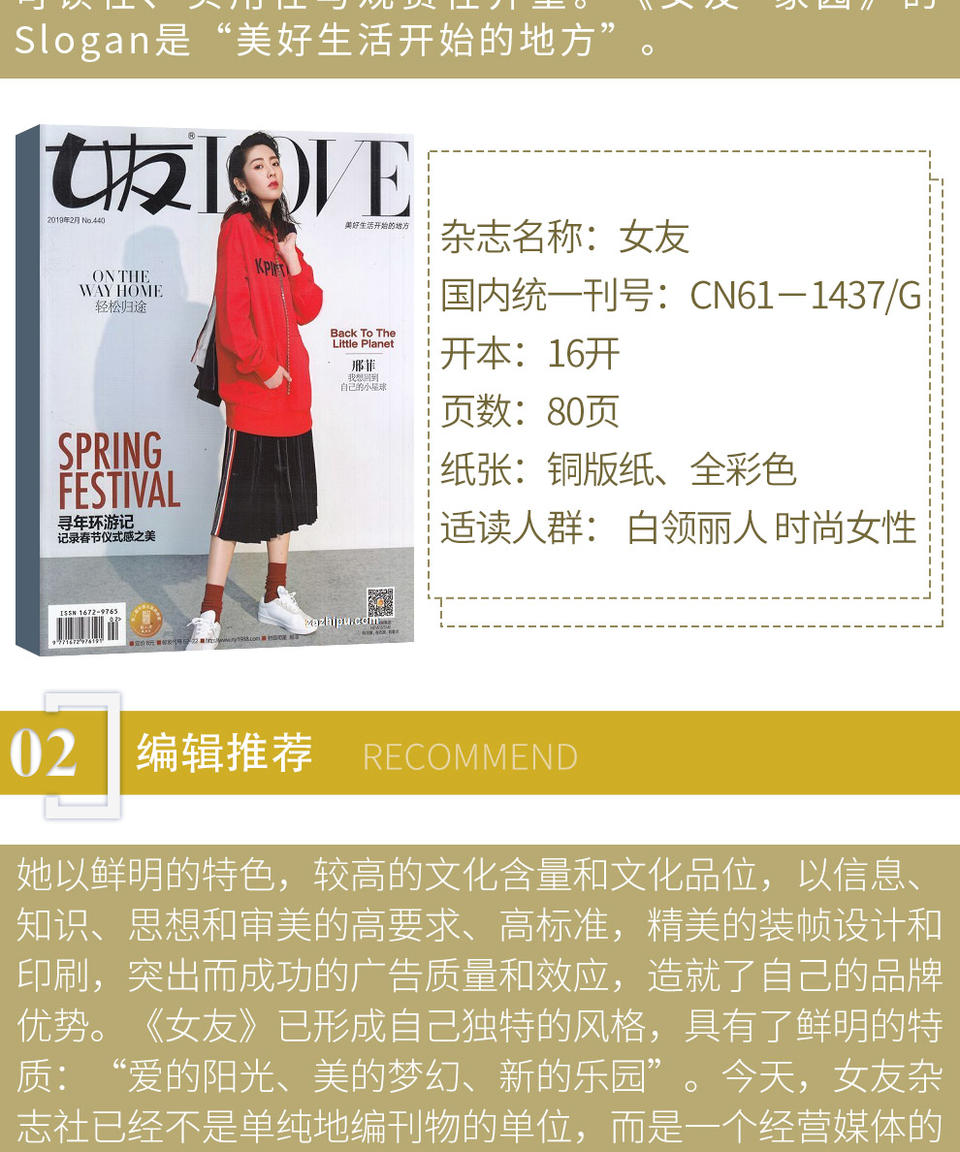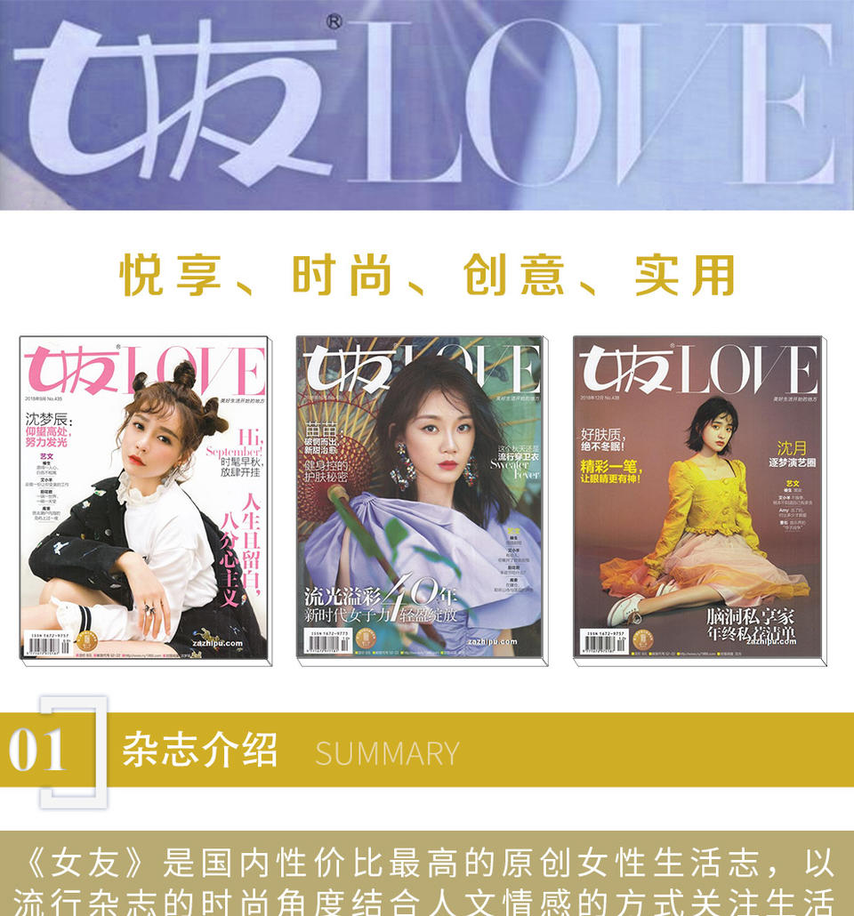 主干读者24-35岁乐于享受家庭生活的城市女性。1988年创刊,30年始终关注美好生活,为女性提供有温度有质感的身心灵养分,美好生活开始的地方!悦享、时尚、创意、实用。高性价比的本土女性生活志!时尚细腻的享受方式,实用创新的生活攻略,引领女性悦享人生,发现生活之美。