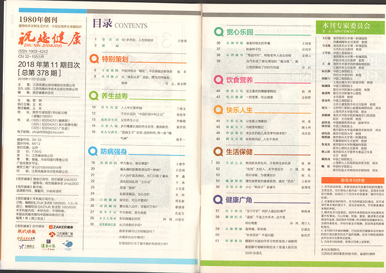 《祝您健康》杂志创刊于1980年,由江苏凤凰出版传媒集团主管,江苏科学技术出版社主办,是国内创刊较早、影响力较大的医学保健类科普杂志之一,也是江苏省唯一的一本医学科普期刊。30多年来,《祝您健康》杂志以科学、实用、可读、信息量大的特色,受到城乡读者欢迎,并多次荣获国家级、省级优秀期刊光荣称号。《祝您健康》杂志系“中国期刊方阵双效期刊”、江苏省一级期刊、华东地区优秀期刊和江苏省优秀期刊。