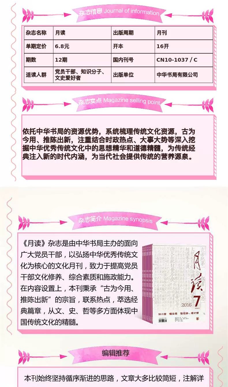 《月读》杂志是由中华书局主办的面向广大党员干部,以弘扬中华优秀传统文化为核心的文化月刊,致力于提高党员干部文化修养、综合素质和施政能力。