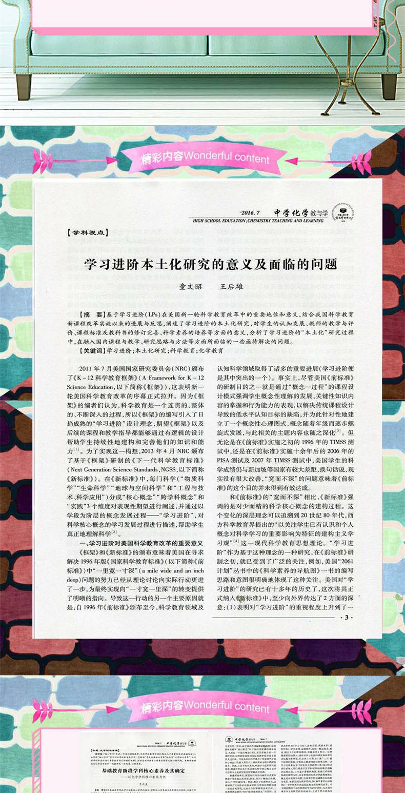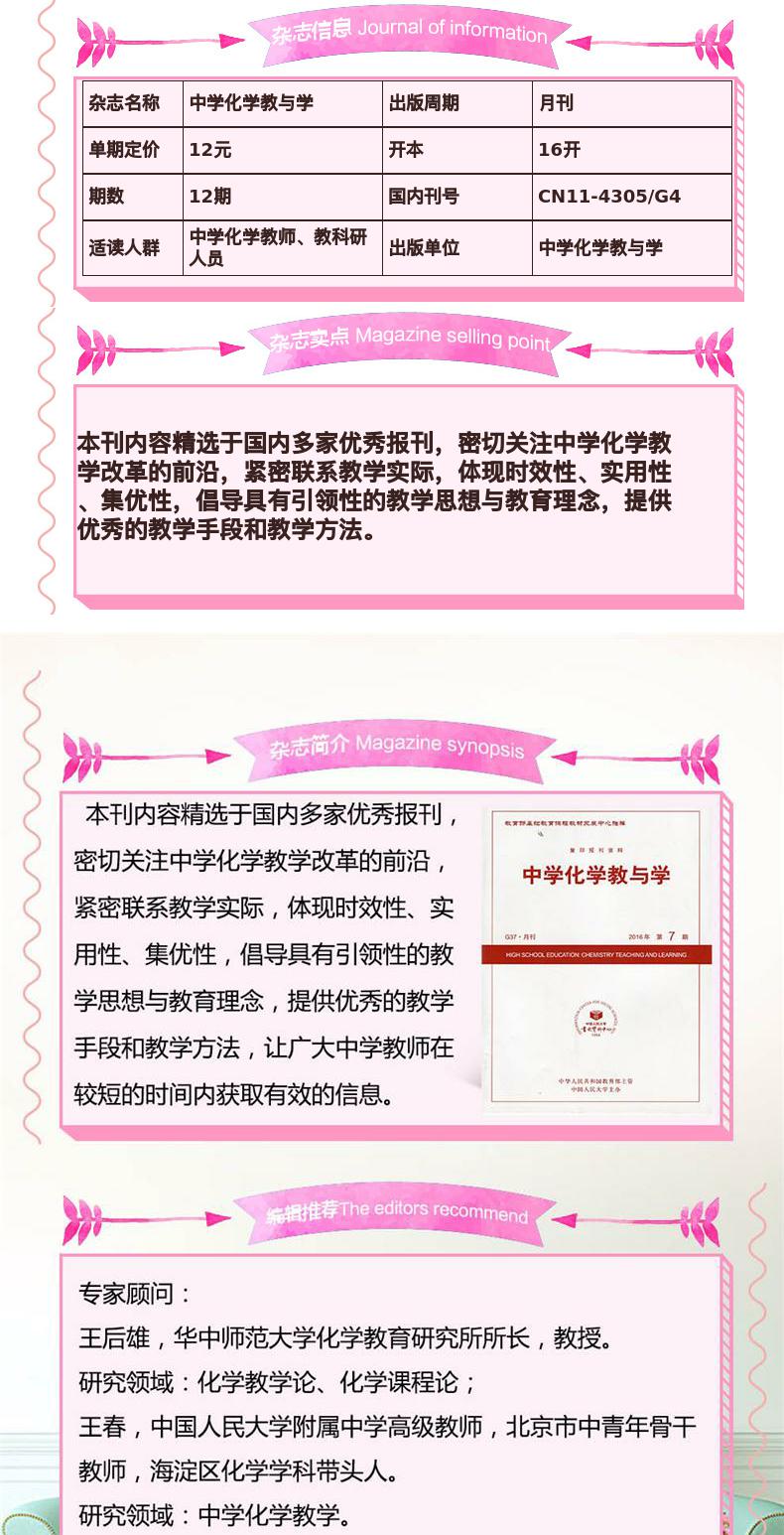 《中学化学教与学》内容精选于国内多家优秀报刊,密切关注中学化学教学改革的前沿,紧密联系教学实际,体现时效性、实用性、集优性,倡导具有引领性的教学思想与教育理念,提供优秀的教学手段和教学方法,让广大中学教师和教研人员在最短的时间内获取有效的信息。