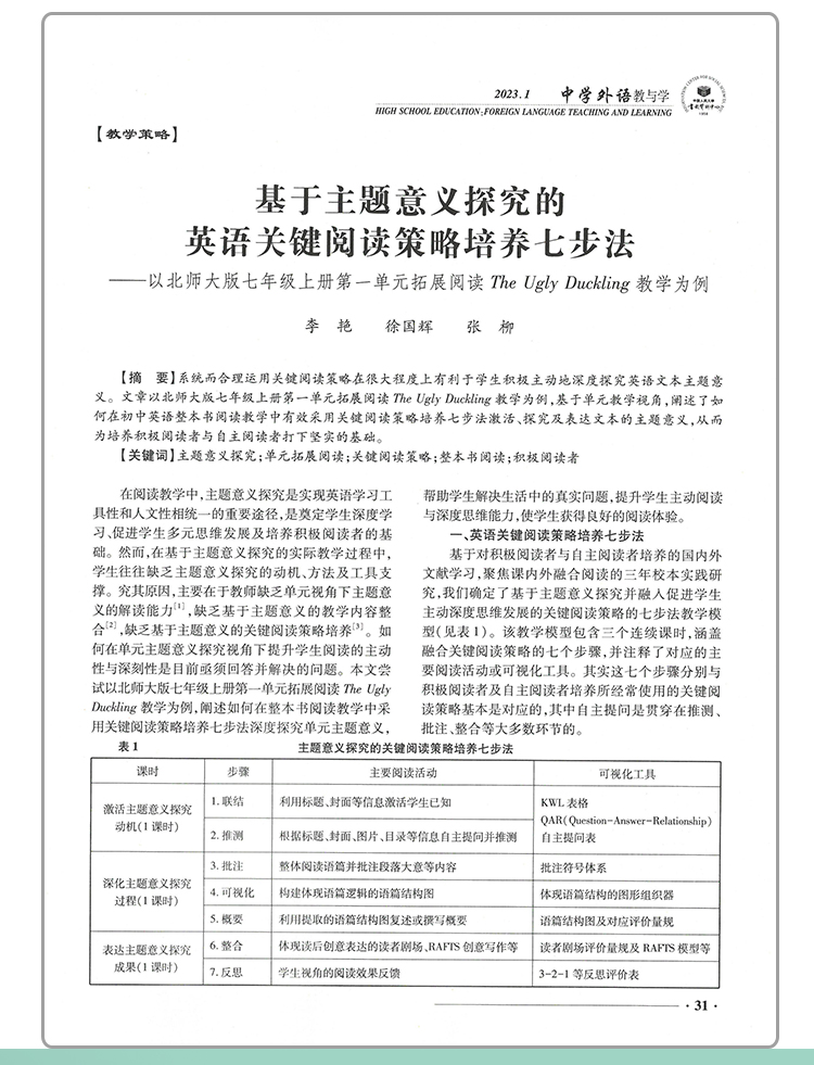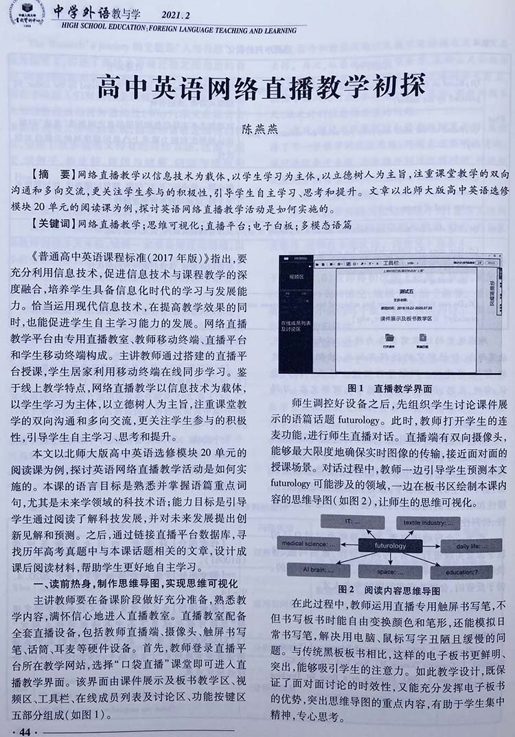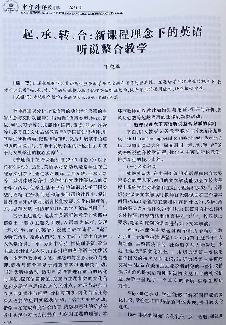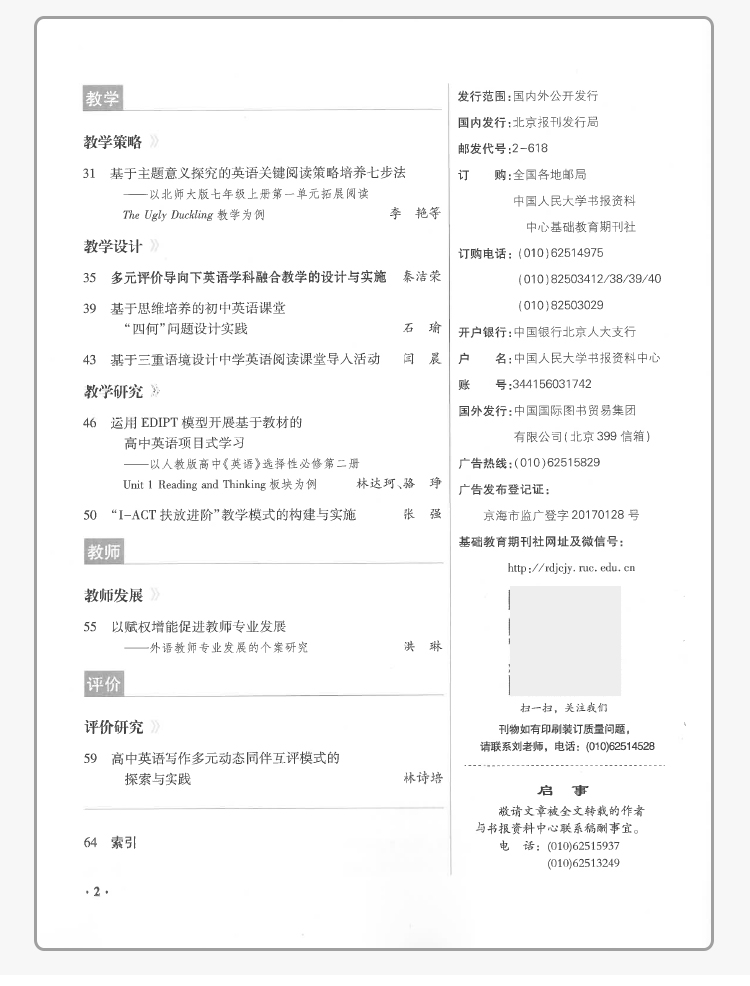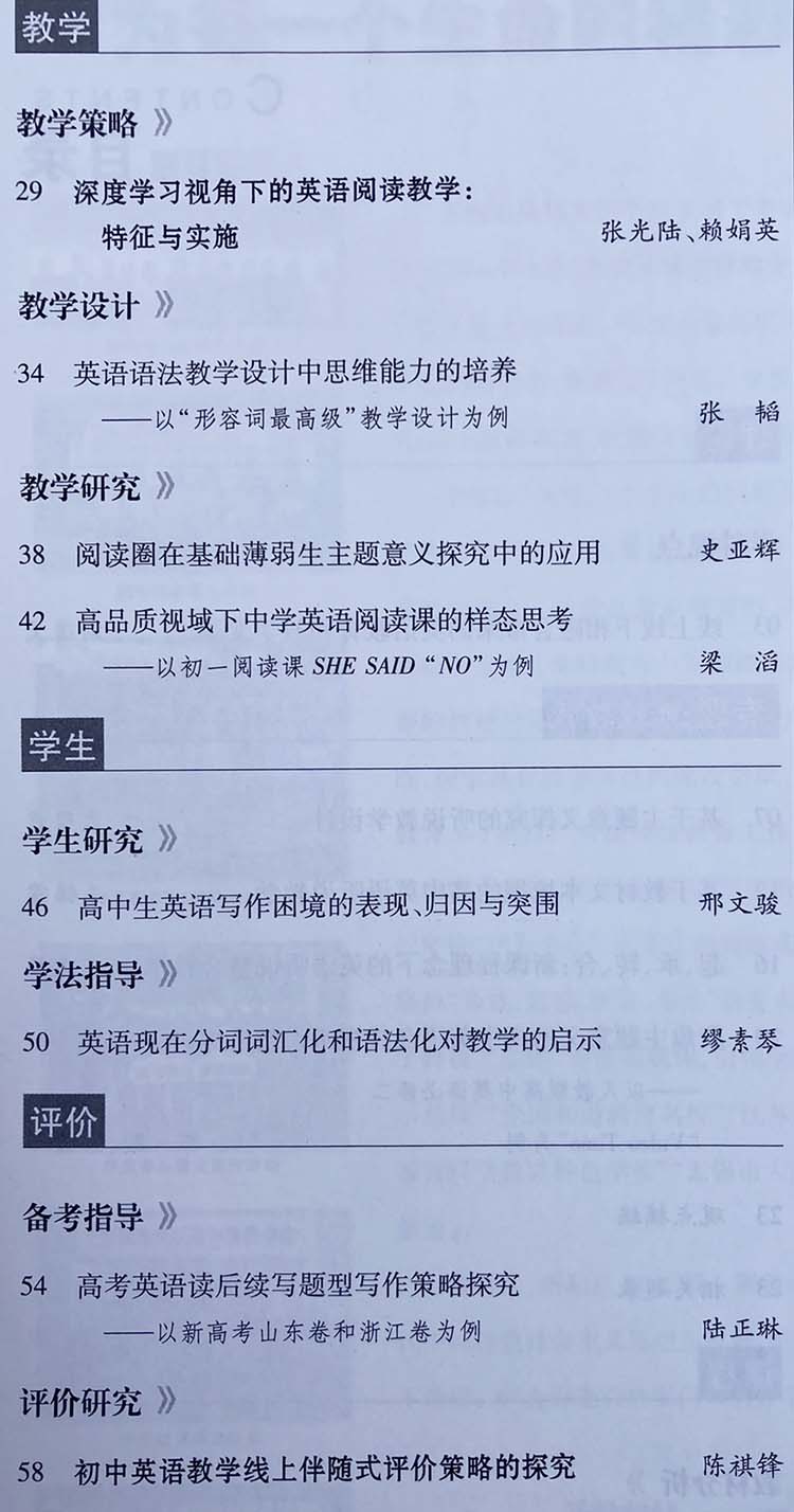 《中学外语教与学》密切关注中学英语教学改革的前沿,精选中学英语教学研究佳作,突出反映当前英语课程改革的新理念、新动态、新成果,倡导具有引领性的教学思想与教育理念,提供典型教学案例,研究高考动向与解题方法,让广大中学教师和教研人员在最短的时间内获取有效的信息。