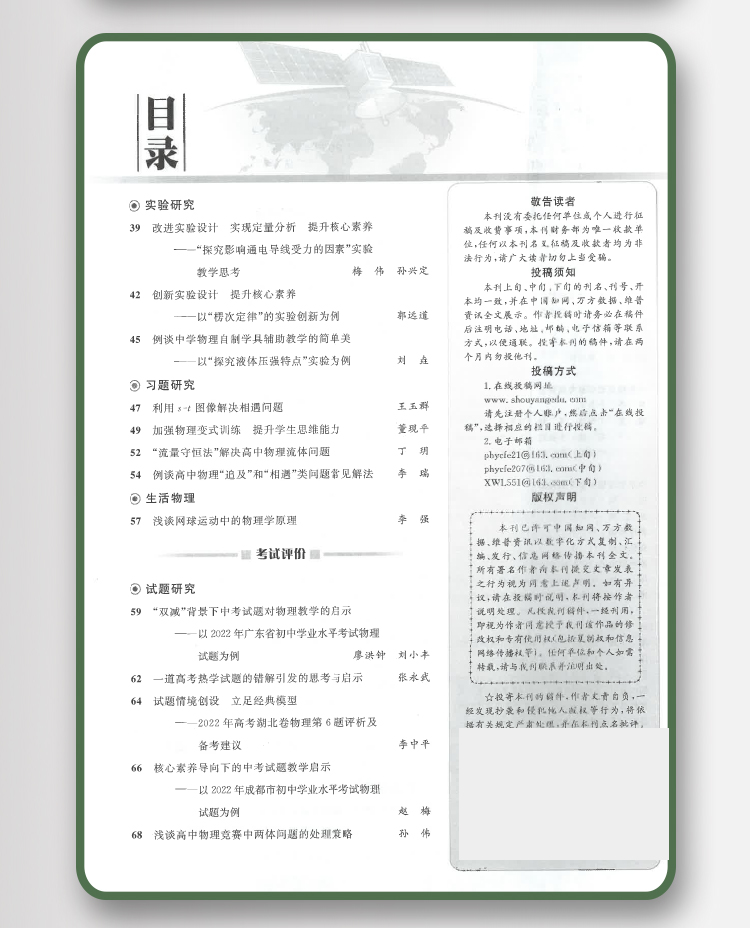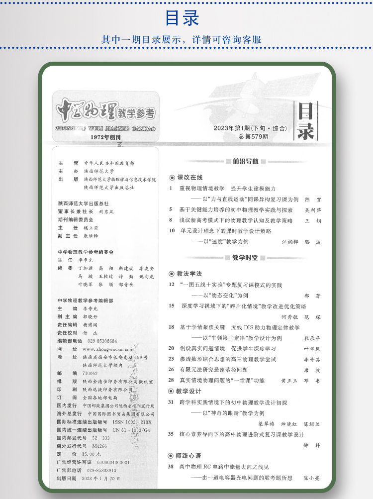 《中学物理教学参考》是国家教育部主管、陕西师范大学主办、由陕西师范大学出版社集团所属杂志社出版,面向国内外公开发行的中等物理教育教学类期刊。自1972年创刊以来,坚持为基础教育服务的办刊宗旨,突出“科学性、知识性、实用性、导向性”特色,发行量一直稳居同类期刊之首。