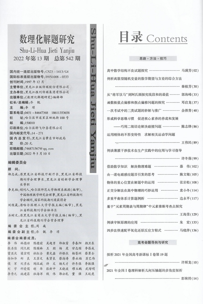 《数理化解题研究》创刊于1997年,系黑龙江省教育厅主管、哈尔滨大学(哈尔滨学院)主办的省级教育专业期刊,是全国知名的数理化教与学的权威刊物。高考版以高考为核心,诚邀全国各地初高中数学、物理、化学名师及一线教师写稿,以分析高考考题设置、数理化考点及解题技巧分析,重难点知识点解析,为学生的高考提供指导。2015年9月变更主管主办单位为黑龙江出版集团。
