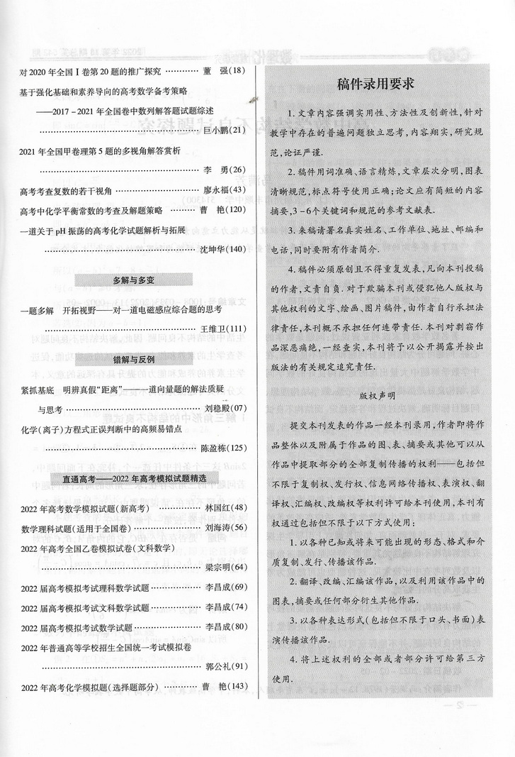 常设栏目:思路·方法·技巧、教材辅导、高考命题导向与应试、学科教育、教学随笔等。
