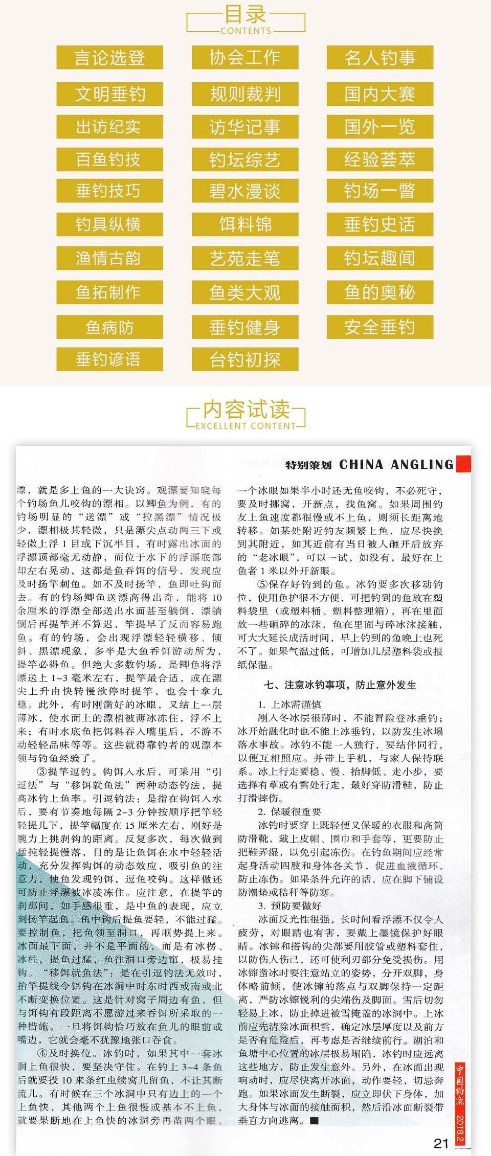 《中国钓鱼》杂志重点介绍垂钓技术和经验,传播国内外垂钓信息,集指导性、实用型、知识性、趣味性为一体。深受广大垂钓爱好者喜爱。