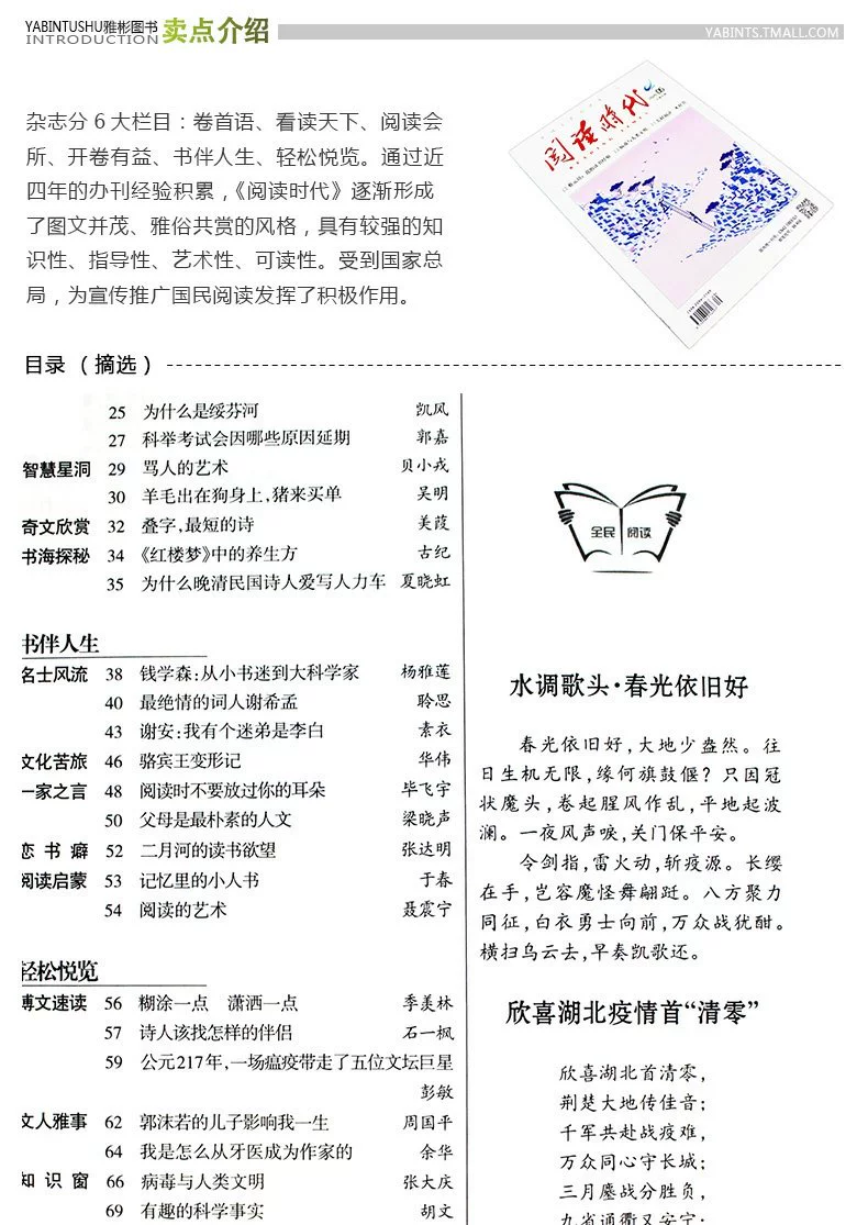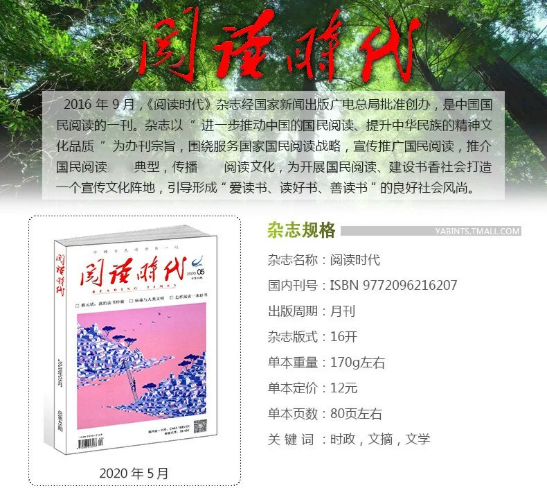 《阅读时代》杂志为中国全民阅读第一刊,是专为指导推进全民阅读工作而创办的,是目前全国唯一一本专职指导全民阅读工作的杂志。创刊以来,以其通俗易懂,亲切入味的特点,越来越受到广大人民群众的喜爱,发行量达18万册。