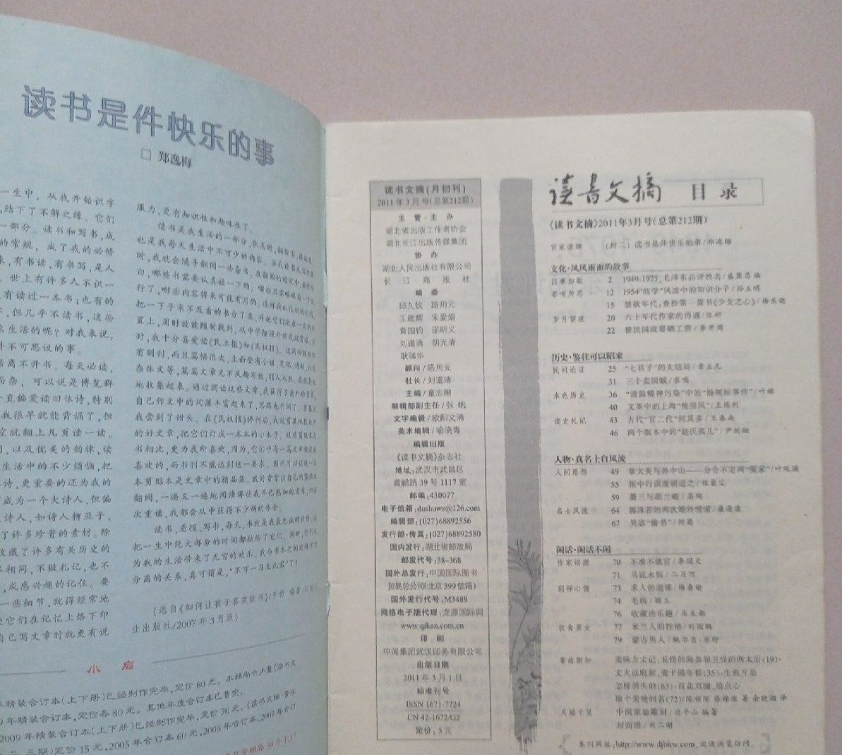 《读书文摘》归属长江出版集团由湖北人民出版社协办,是一本以思想性为指导、明确面向广大读书人的刊物,基本思路是“古今中外,天下妙文”,尤其注重对国内各出版社最新书籍内容的推介。刊物问世后,受到广大读者的普遍好评,特别是在文化发达的地区和省会城市如北京、上海、南京、武汉、成都、杭州、重庆、长沙等地已经形成了广泛而固定的读者群。被四川电视台文化栏目推荐为2002年文化类五种重点期刊之一。为了给年轻人一个更加精彩的读书舞台,本社经过年余时间的精心组织与筹划,本着“从群众中来,到群众中去”的理念,组织大学生编辑组,在充分迎合现代青年的关注与喜爱之上,于2004年10月新推出一本针对大学生为主的青年群体的文摘类月刊《读书文摘?青年版》。