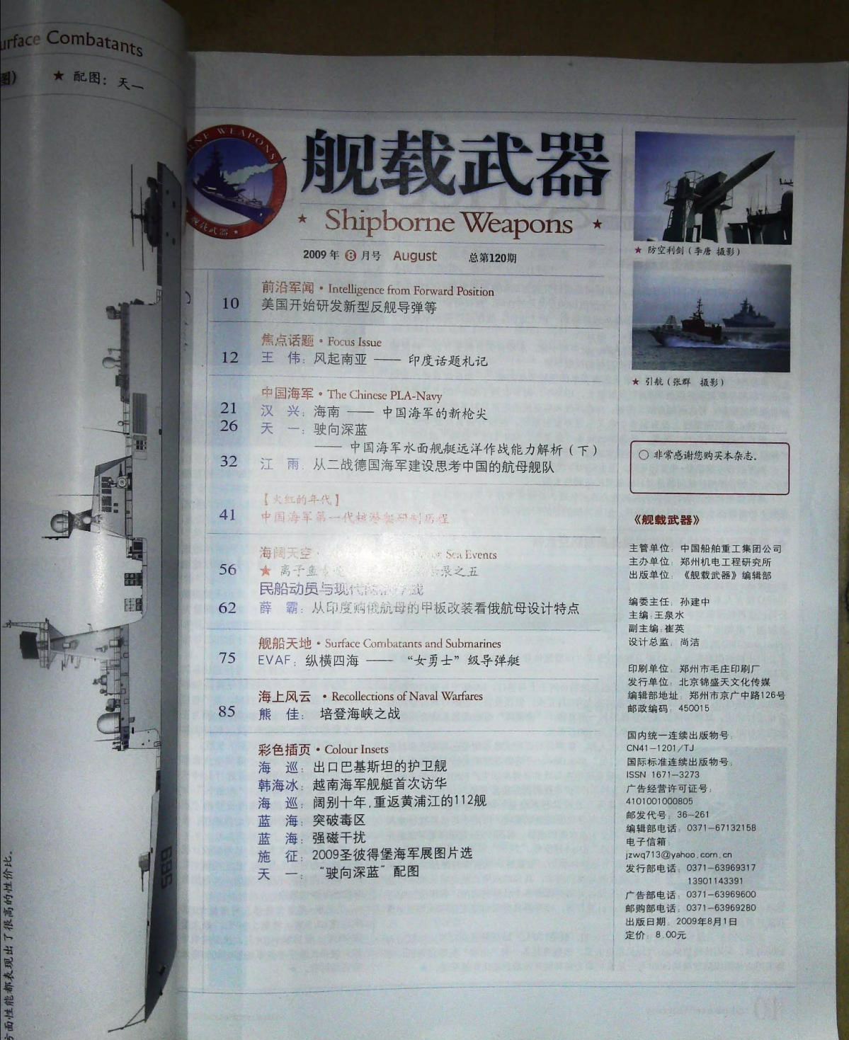 《舰载武器》杂志是国内著名的大型军事月刊,主要推介中国海军建设,点击各国舰载兵器,追踪当今世界热点,报道全球军事动态,资料新颖,内容翔实,集深度、权威、品味、时效于一体,具有很强的技术性、可读性、知识性和收藏价值。本刊图文并茂,生动活泼,印制精美,别具一格,信息量之大当属同类刊物之首,是社会各层面读者之良师益友。