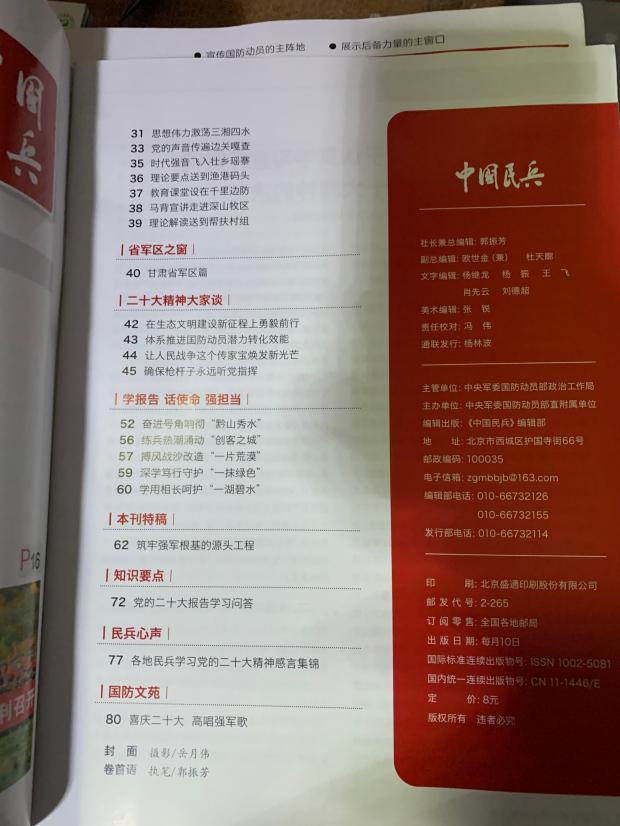 《中国民兵》创刊于1984年,由解放军报社主管主办。是国防教育刊物。主要指导民兵、预备役工作,进行国防教育,普及国防军事知识,指导大中学生军训。