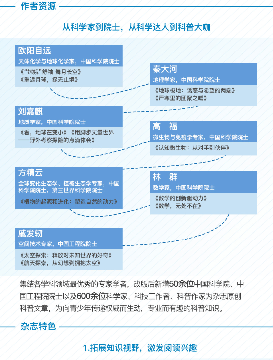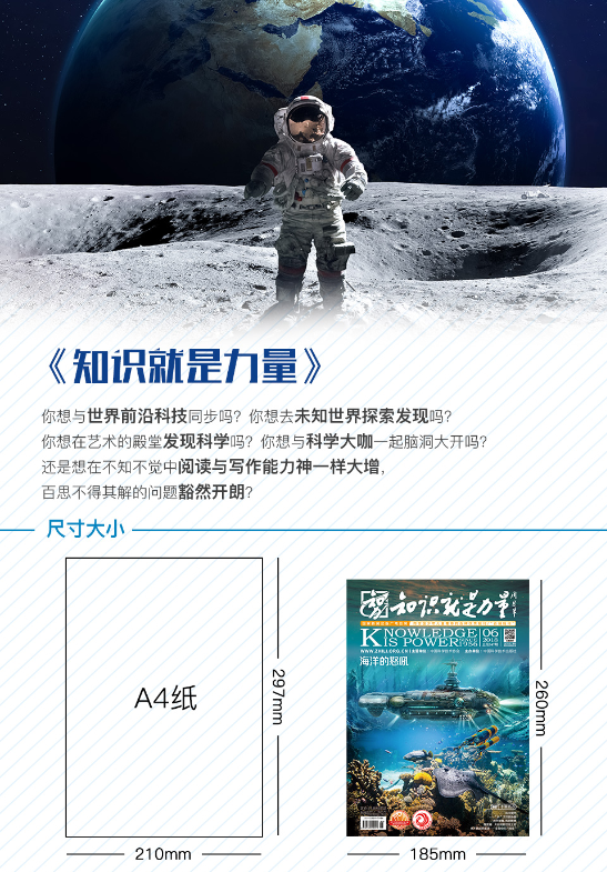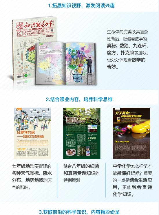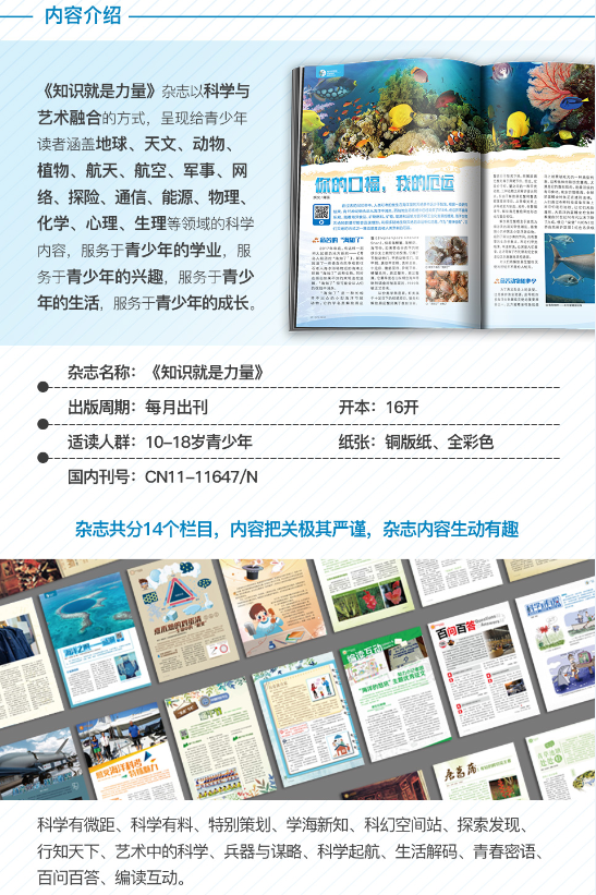《知识就是力量》创刊于1956年,由周恩来总理亲笔题写刊名,是由中国科学技术协会主管,中国科学技术协会、中华全国总工会和共青团中央联合主办的青少年综合图文科普月刊。