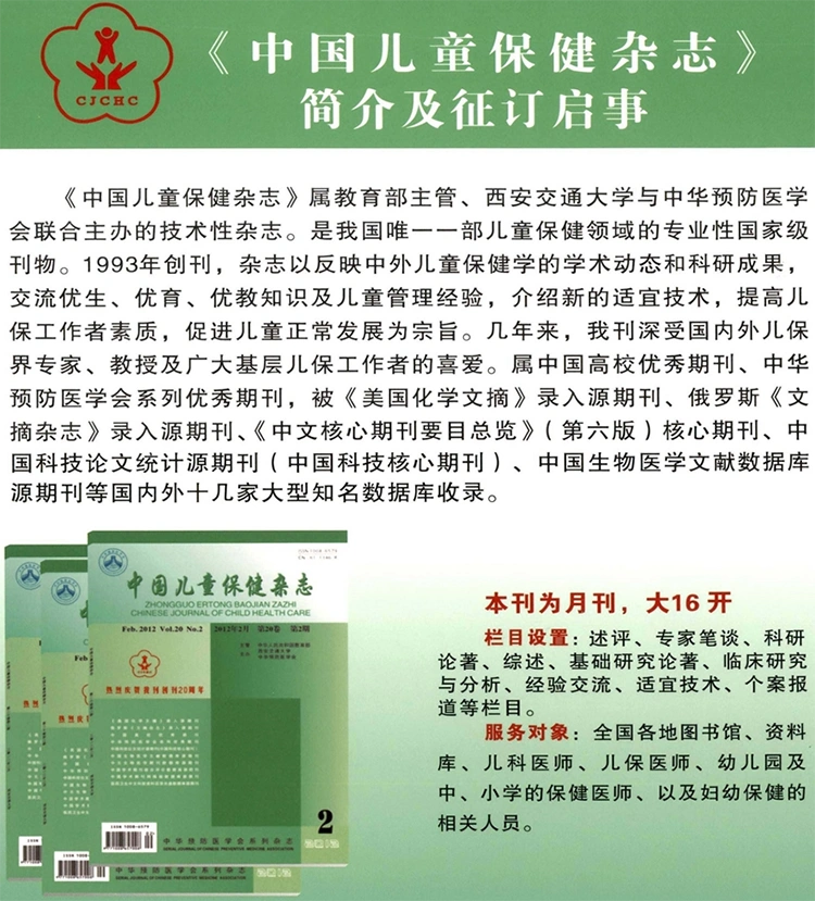 《中国儿童保健杂志》(月刊)创刊于1993年,是由教育部主管,西安交通大学和中华预防医学会联合主办的国家级技术类杂志,是我国唯一一部儿童保健领域的专业性期刊。荣获中文科学科学核心期刊、陕西省优秀科技期刊。