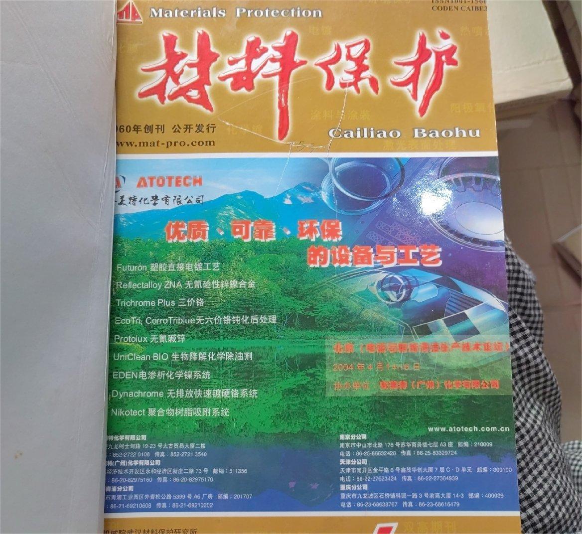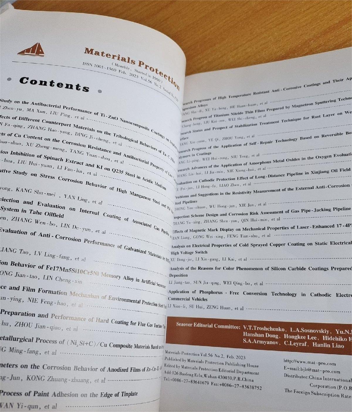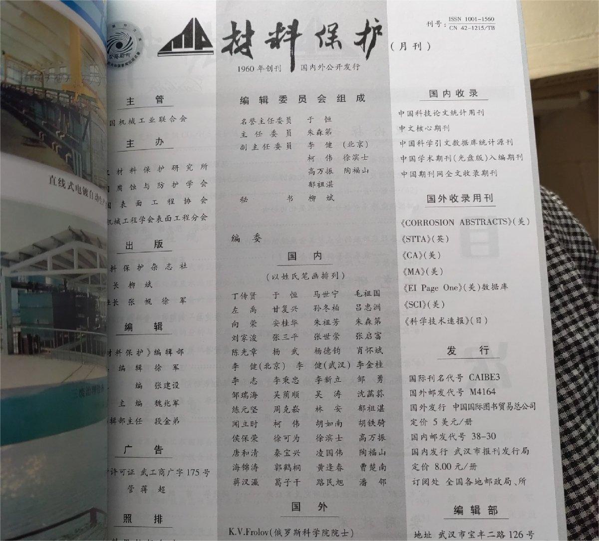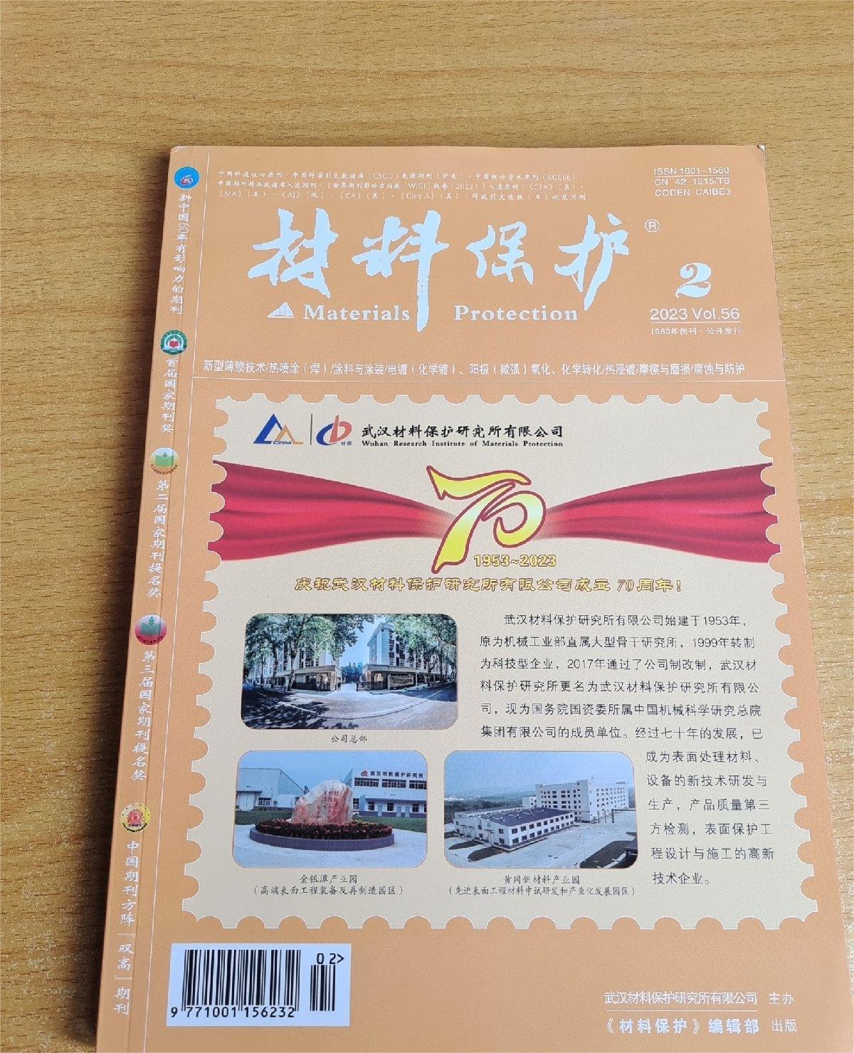《材料保护》(月刊)创刊于1960年,是由武汉材料保护研究所、中国腐蚀与防护学会、中国表面工程协会,中国机械工程学会表面工程分会主办的全国性表面应用技术杂志,面向国内外公开发行,属中文核心期刊。曾荣获首届国家期刊奖,第二届中国期刊提名奖,入选中国期刊方阵双高期刊。获奖情况:中国优秀期刊;中文核心期刊;中国科技论文统计源用刊;中国期刊方阵“双高”期刊.