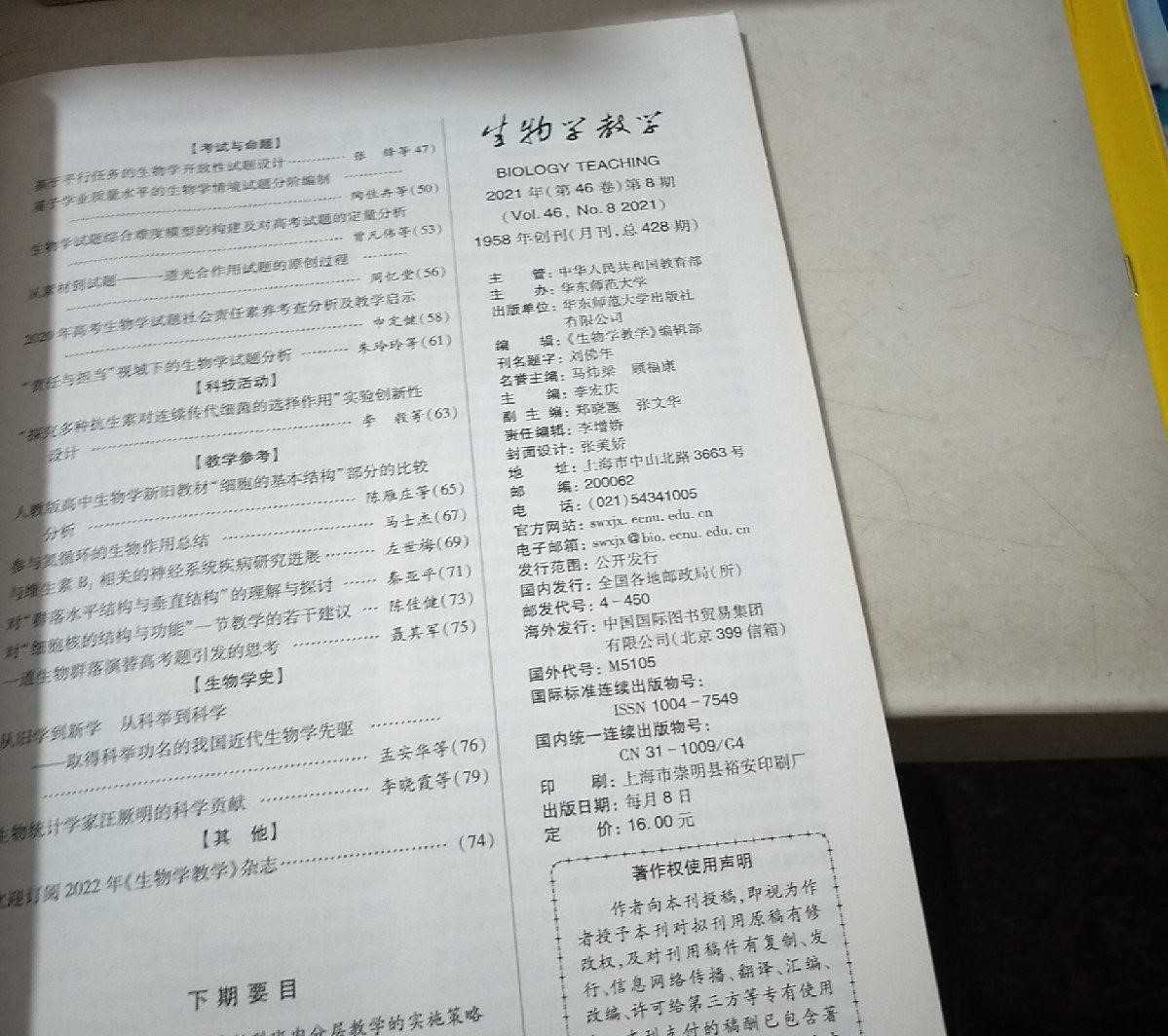 《生物学教学》(月刊)创刊于1958年,是由中华人民共和国教育部主管、华东师范大学主办的全国教育类核心期刊。创刊50多年来,《生物学教学》努力为读者、作者服务,密切读者、作者和编者的关系,已经在中学生物学领域成为我国生物学教育工作者提高学术水平及教学水平、促进我国生物学教育教学改革的一种重要媒体,成为我国中学生物学教师的良师益友。杂志面向国内外正式发行,主要读者对象为中学和中等职业学校的生物学教师,兼顾高校和其他生物学工作者。 《生物学教学》刊载稿件的栏目和内容:“生物科学综述”、“生物学科技信息”、“教学参考”:国内外生物科学的新进展、新成果和具有应用参考价值的教学基础资料;“国家课程标准与实验教材”:国家课程标准及实验教材教学的理论和实践;“教师教育”:高校、中等学校和教育管理部门培养高质量生物学教师的实践及体会;“教育教学研究”、“课堂教学”、“信息技术应用”、“国外教育动态”和“现代教育论坛”:现代教育教学理论研究、课堂教学实践与教学设计、国外教育动态和多媒体技术应用等;“考试与命题”:新课程的考试命题和解题研究(与高考有关的文章须提前4~6个月投稿),有选择地刊登全国及地方高考生物学试卷;“实验教学”:实验教学的研究、设计和实验方法的改进;“科技活动”、“学生实践与创新”、“科学技术与社会”(STS):课外科技活动的成功案例,以学生为主体开展的探究式活动的实例,以及有助于拓展读者视野的STS教育的内容等;“读者之窗”:问题征答,读者对有关问题的来信或建议等。另外,封面、封底刊登作者投寄的生物照片。
