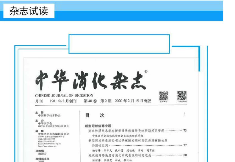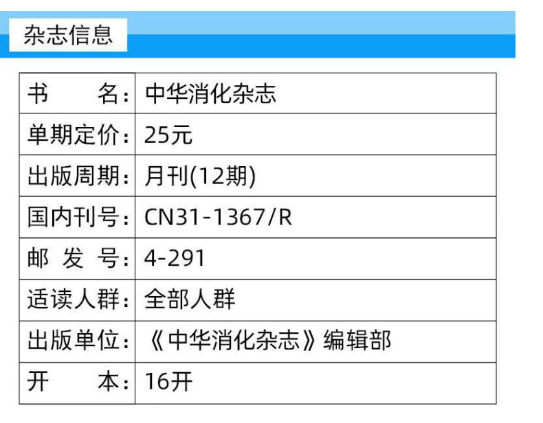 《中华消化杂志》报道消化系统医学领域内基础理论与临床诊疗方面的研究成果。辟有临床病理讨论、综述、论著摘要、病例报告等栏目。读者对象为消化科中、高级医师。 《中华消化杂志》被北大1992版核心期刊、北大1996版核心期刊、北大2000版核心期刊、北大2004版核心期刊、北大2008版核心期刊收录。