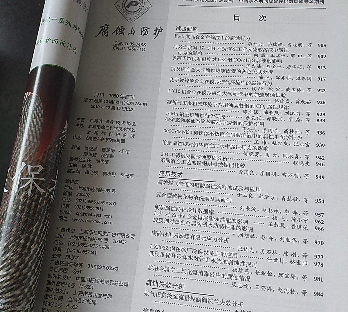 《腐蚀与防护》本刊是国内最早的腐蚀专业学会——上海市腐蚀科学技术学会的会刊,也是国内创办最早的腐蚀专业杂志之一,为领域内的学术交流和技术成果推广作出了重要贡献。2004年经专家评审,《腐蚀与防护》杂志被编入《中文核心期刊要目总览》,在此之前本刊已被包括NACE International、ENGINEERING INDEX、Elsevier等国外多家重要检索系统收录。腐蚀科学是一门新兴的边缘学科,为减轻因腐蚀造成的经济损失,各界对这门学科的重视程度以及对相关技术的需求正呈现不断上升的趋势,我刊恰好顺应了这一需求。刊物特点体现在:不限于某一行业的专门问题,而是着眼于普遍的规律和现象;注重理论对实践的指导,偏重先进的实用性技术的推广。因此,刊物适合国民经济各领域的科学技术人员和管理人员阅读。