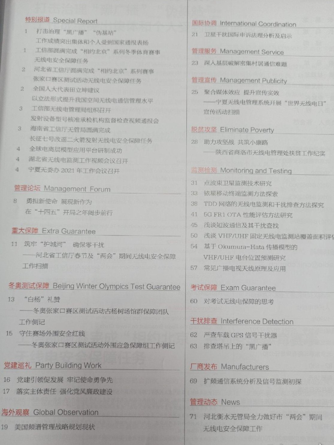 《中国无线电》杂志设有特别报道、资源管理、监测检测、干扰查处、行业之窗、军队园地、协会之家、技术前沿、厂商发布等栏目,是无线电管理机构对外宣传的重要载体,是业界了解无线电管理工作的重要窗口,是促进无线产业各方沟通、交流、合作的重要桥梁和纽带。