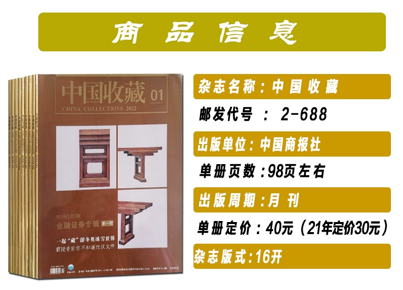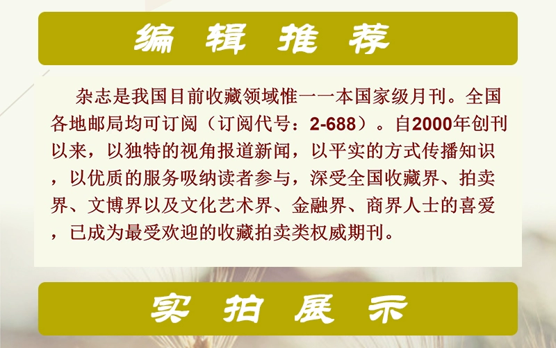 《中国收藏》杂志100页全彩色印刷,设计高雅,印刷精美。现分为“关注”、“典藏”、“市场”、“互动”四大板块,包括聚焦天下、灿烂精华、藏家论道、长史纪略、风情民俗、藏友自荐、藏品估价等一批优秀栏目,成为全国各地以及日本、新加坡、台湾、香港等国家和地区的收藏者每月定期的精神大餐。 《中国收藏》杂志还广泛联系全国各地收藏组织、收藏家及收藏爱好者,并建立了《中国收藏》个人资料库、民间藏刊资料库。《中国收藏》个人资料库已接收成员数千人,民间藏刊已收集各类收藏组织、爱好者创办的报刊上千种,在此基础上举办的交流、讲座、交易、展览、评比等活动受到广泛好评。 《中国收藏》杂志还是多家拍卖公司、收藏市场、古玩城以及工艺品、礼品企业发布信息、广告的重要园地,所发布的信息广告往往具有十分良好的反馈。