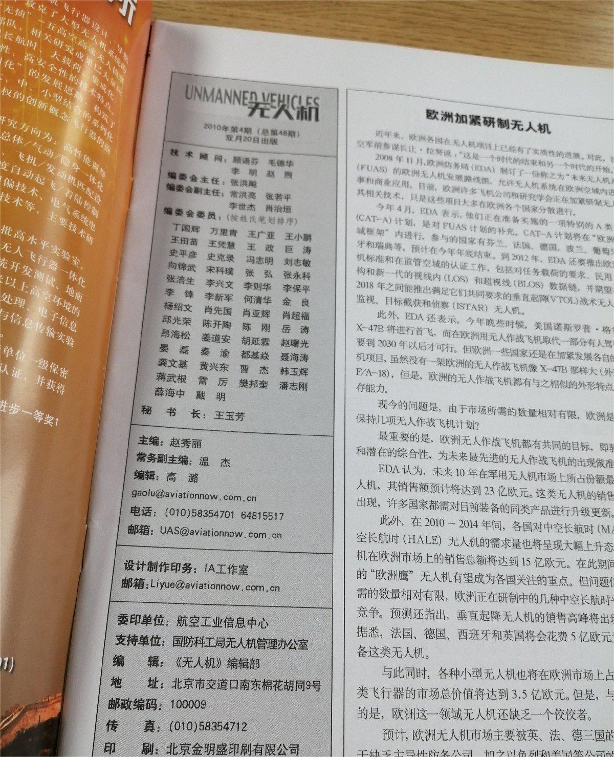 《无人机》杂志由国防科工委创刊于2002年8月,是国内一本专业全方位报道无人机系统发展动态的综合性信息刊物,也是目前拥有新闻出版署正式刊号的无人机媒体,由中国航空工业集团有限公司主管、中航出版传媒有限责任公司主办的无人机平面媒体。报道内容主要涉及无人机系统领域的发展动向和热点、关键技术研究成果、型号和设备研制进展、市场分析、作战应用和重大活动等,是一本集权威性、专业性和时效性于一体的无人机领域综合类杂志。《无人机》杂志大众版于2020年1月开始创立、策划、编辑、出版,全方位报道无人机与大众生活息息相关的新闻、热点、资讯、产品、人物、赛事、摄影、科普活动、驾驶体验等内容,是一本集娱乐性、科普性、独特性、和新颖性于一体的无人机科普读物。
