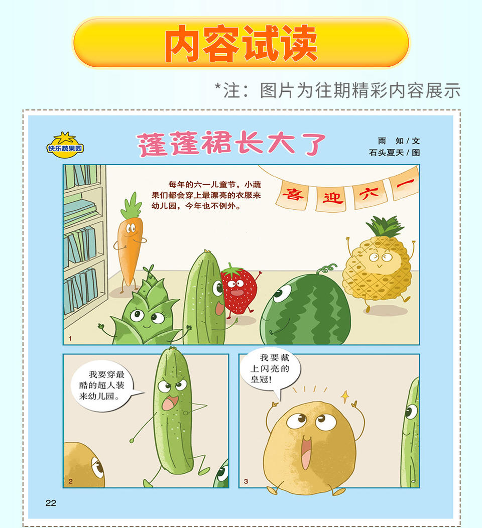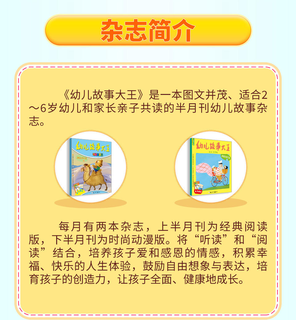 杂志每月有两本,上半月刊经典阅读版,上半月刊为时尚动漫版。每月都有绘本故事、安全故事、冒险故事、成长故事、科学故事……轻松幽默,寓教于乐,尽情满足孩子爱听故事的渴望,让孩子在阅读中获得成长。