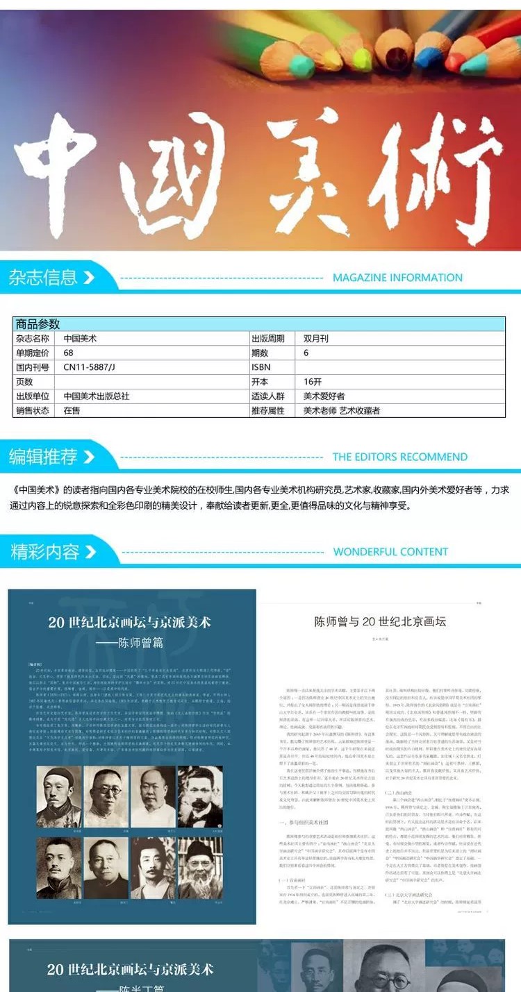 《中国美术》(双月刊)创刊于2009年,是由中国出版集团主管,中国美术出版总社(人民美术出版社)主办的国家级大型美术专业期刊。中国美术出版总社有限公司,是一家主办杂志的权威出版社。刊物定位:覆盖中国美术行业,强调公正性、专业性、权威性,以弘扬真善美的艺术精神为己任的艺术类核心期刊。办刊理念: 坚持党的文艺方针和出版导向,弘扬民族传统文化,充分反映我国当前美术界繁荣发展的整体面貌和时代精神。 秉持公正立场,针砭时弊,扫荡谬误,弘扬正气,提升艺术鉴赏能力和审美水平。 3、重点展示优秀美术作品和美术理论研究成果,促进学术交流,反映美术动态,引导美术思潮,记录当代中国美术发展历程。 4、突出“大美术”概念,倡导创新、突出特色。 5、为当代艺术立传,为艺术院校、艺术家和画廊等艺术机构搭建一个高端的交流展示平台;为读者奉献一份内容编排生动鲜活,装帧、印制精美的国家级美术专业期刊。
