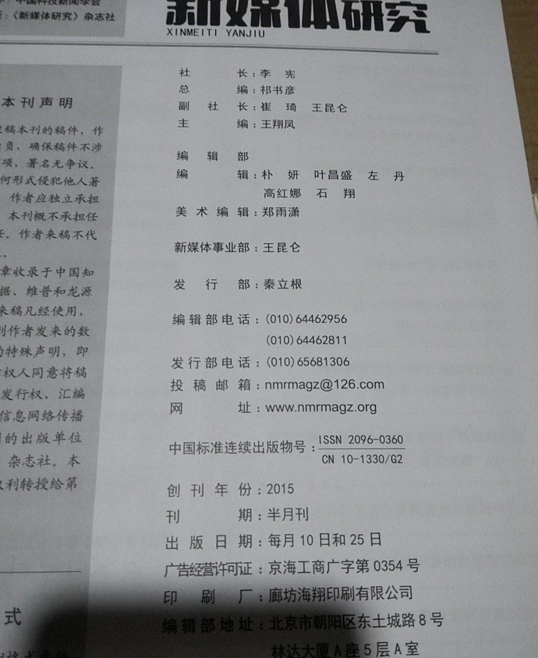 新媒体研究 《新媒体研究》是由中国科技新闻学会主办,期刊荣誉为:中国学术期刊(光盘版)全文收录期刊。《新媒体研究》的办刊宗旨:重点刊载新媒...