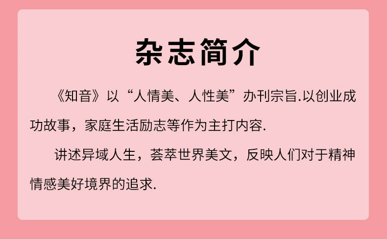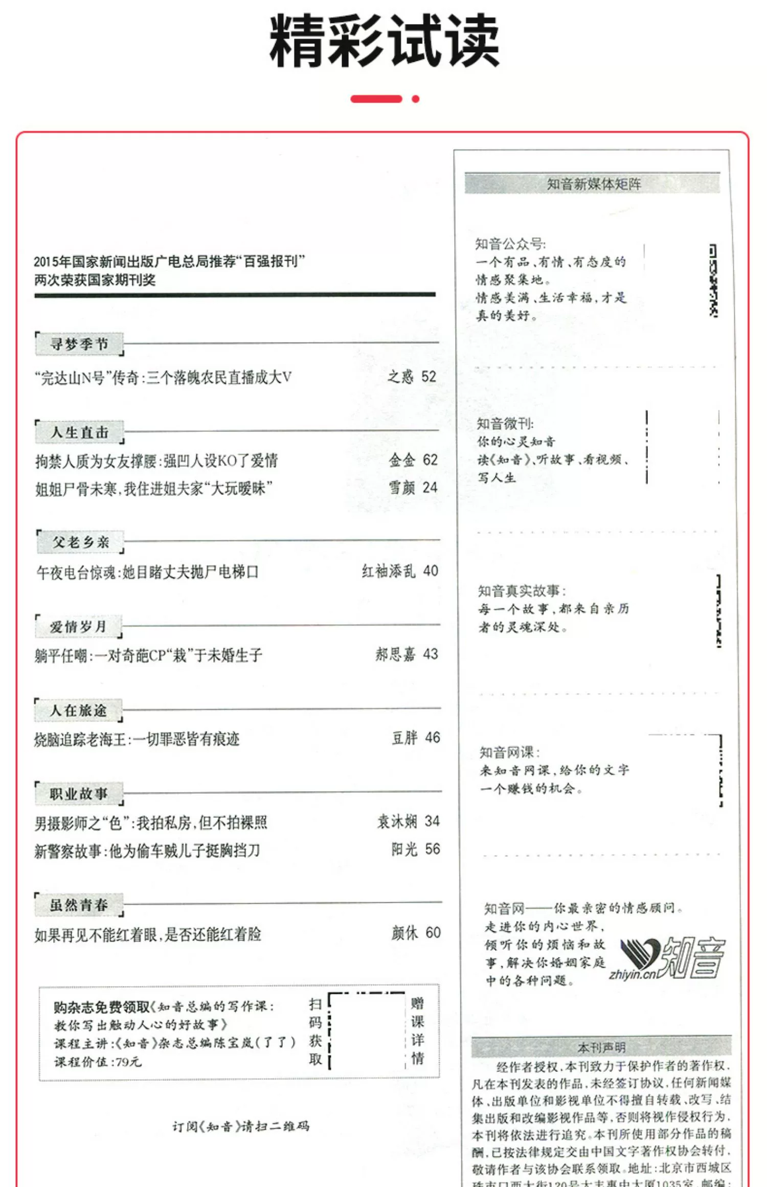 《知音月末版》正式推出后,将与上下半月版全面接轨:讴歌人情美、人性美,是她同样的理念和灵魂;突出纪实性、故事性、情感性,是她同样的风格和特色;深入生活、深入实际、深入心灵,是她同样执著追求;坚持篇篇可读、期期精彩,是她同样的郑重承诺!