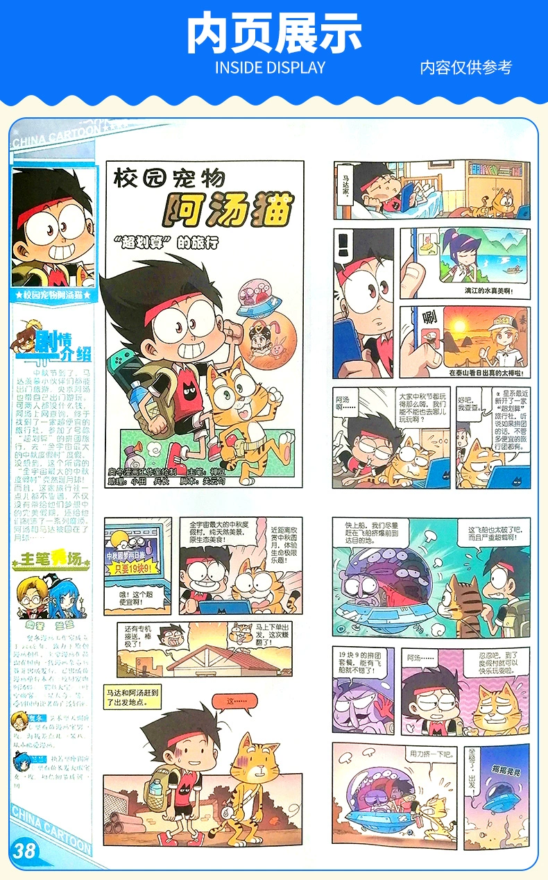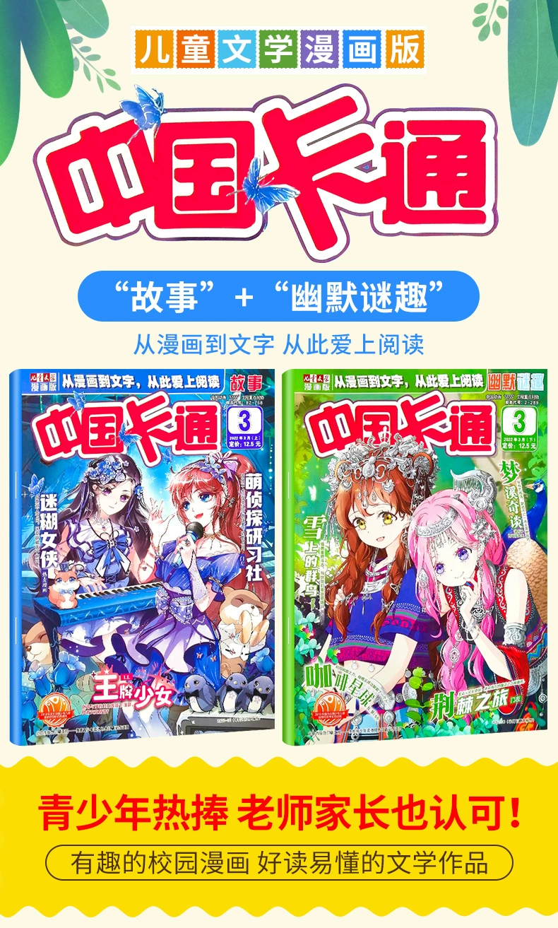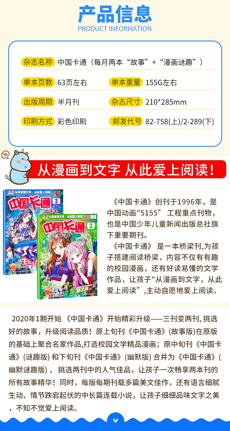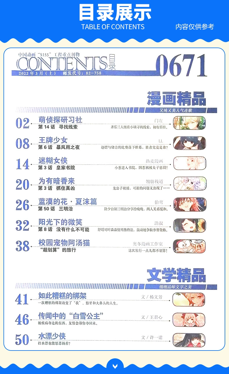 《中国卡通》(幽默谜趣版)——《见习魔法师》《梦溪奇谈》《梦的花粉店》《星动奇迹》《离殇秋歌》《星河在你眸中》《完美约定》等精品漫画趣味连载,带孩子走进奇幻世界。每期还有精短美文、短篇佳作以及中长篇连载,从漫画到文字,让孩子爱上阅读。另外,精心设置“读编往来”环节,伴随孩子成长的每一步。