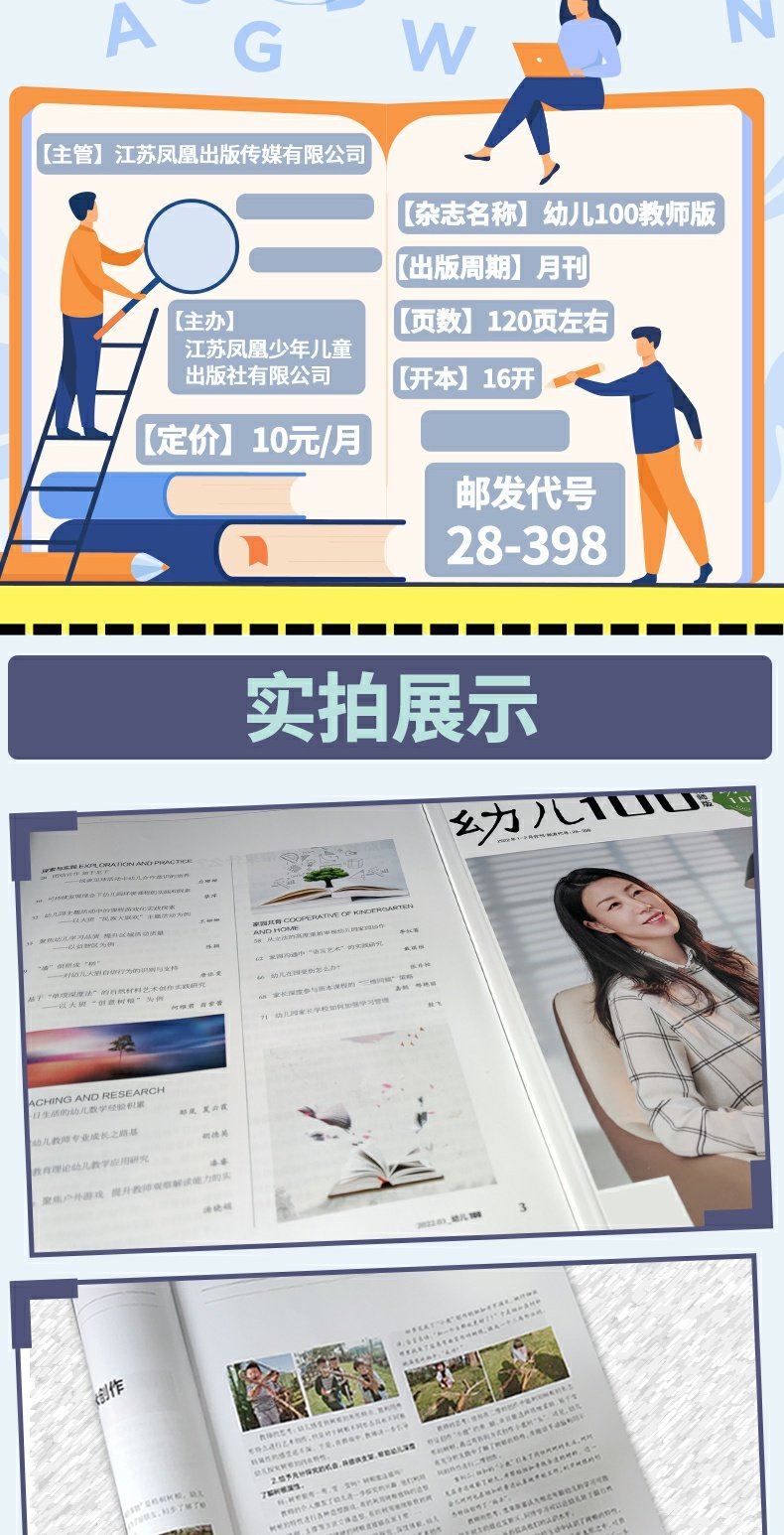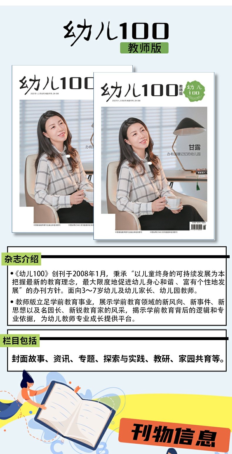 《幼儿100》,2008年创刊,由益智版、阅读版和教师版组成。本刊关注幼儿身心发展的特点,尊重幼儿学习过程的独特性,将现代教育理念融入其中,综合幼儿在园学习、家庭教育和社区生活的各种元素,使幼儿能和谐地发展,愉快地成长,全面提高语言、社会交往、艺术、科学、动手操作等各方面能力,最大限度地开发幼儿的潜能,激发他们的探索欲望和学习兴趣。为幼儿的成长服务,为幼教事业的发展服务。 华东六省优秀少儿期刊。创刊以来,始终坚持“以儿童终身的可持续发展为本,把握最新的教育理念,最大限度地促进幼儿身心和谐、富有个性地发展”的办刊方针。拥有一流的幼教专家、文字作者和绘画作者队伍,使全书图文并茂,带给读者美好的阅读体验。 幼儿阶段所受的教育对人的一生有至关重要的影响。在幼儿家庭教育方面,很多家庭还停留在满足于孩子的物质需求上,孩子在家庭教育中不能获得充分的发展。本刊为幼儿提供一种优良的精神资源,引导家长给孩子营造良好的氛围,陪伴孩子阅读、游戏,促进幼儿能力的发展。