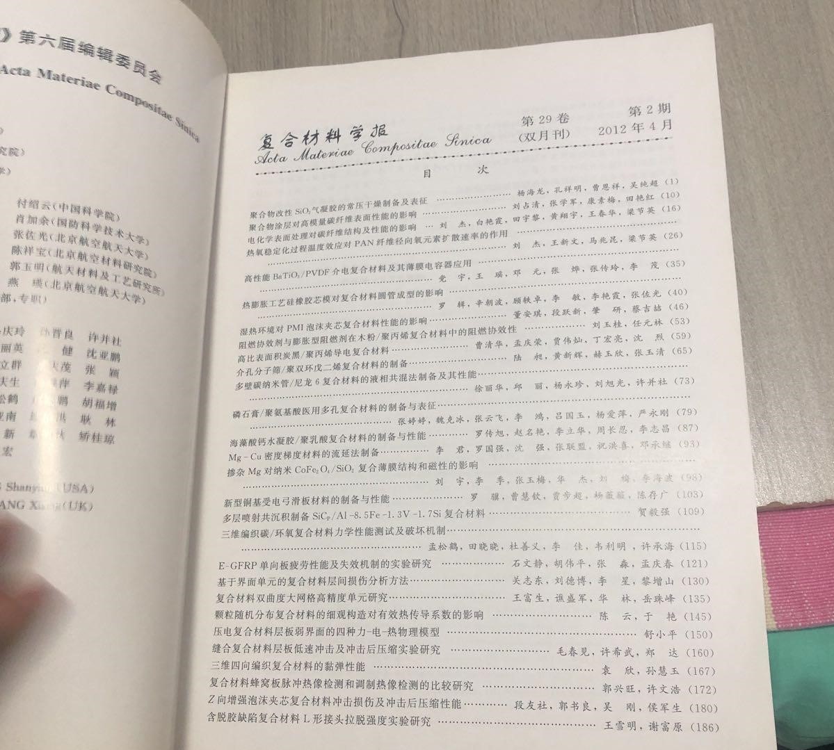 《复合材料学报》本刊主要刊载我国复合材料基础研究和应用研究方面具有创造性、高水平和具有重要意义的最新研究成果的论文。刊载范围:纤维、织物、颗粒或晶须增强聚合物基、金属基、陶瓷基等复合材料及其复合薄膜或复合涂层材料(包括:结构、功能、生物骨结构、电子、建筑等复合材料)的制备、性能、设计等,以促进国内外复合材料研究领域的学术交流及先进复合材料的推广应用。是美国工程索引《EiCompendex》的核心检索收录刊,同时也是美国化学文摘《CA》、俄罗斯文摘杂志《AJ》、美国应用力学评论《Appl.Mech.Rev.》、剑桥科学文摘(工程类)《CSA2》等国际检索系统用刊。在中文数据库中,为《中国期刊网全文收录数据库》的核心收录期刊。