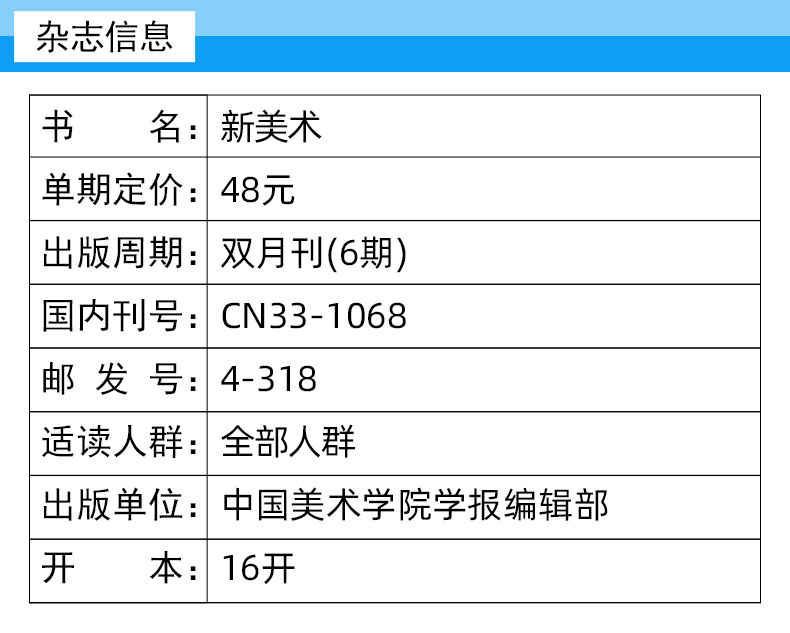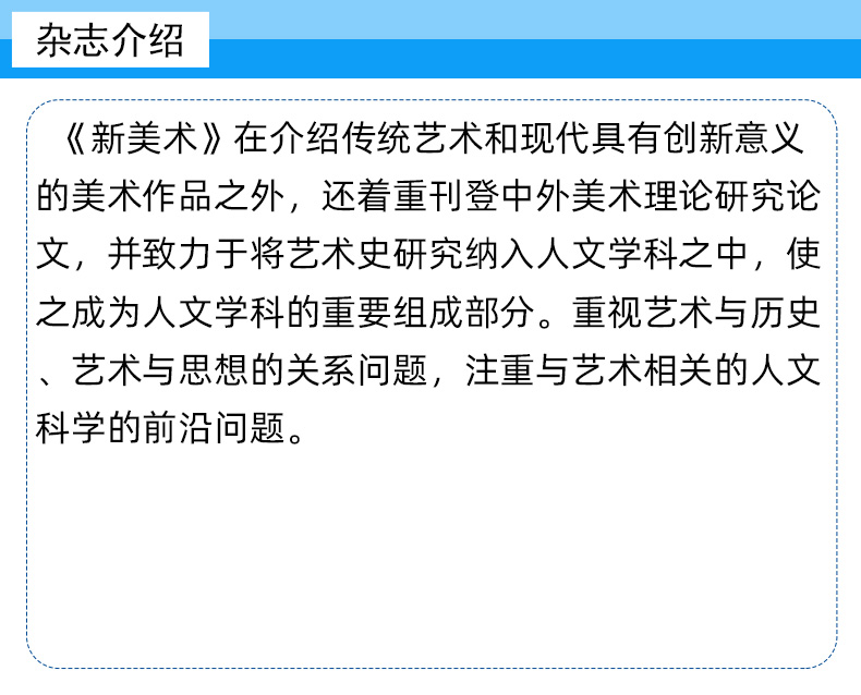 《新美术》(月刊)创刊于1980年,由中国美术学院主办。该刊物素以学术性强而受到人文科学研究者的推崇。《新美术》在介绍传统艺术和现代具有创新意义的美术作品之外,还着重刊登中外美术理论研究论文,并致力于将艺术史研究纳入人文学科之中,使之成为人文学科的重要组成部分。重视艺术与历史、艺术与思想的关系问题,注重与艺术相关的人文科学的前沿问题。近年来,《新美术》日益受到国内外学者的重视,被评为国家核心期刊,并在《中国社会科学引文索引》(CSSCI)及《中文核心期刊要目总览》等排名中都因刊物的学术水准和办刊质量被列为美术类首位。《新美术》被北大1992版核心期刊、北大1996版核心期刊、北大2000版核心期刊、北大2008版核心期刊收录。