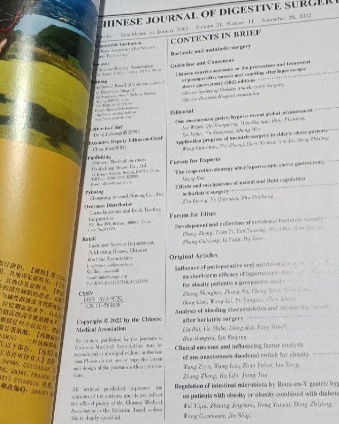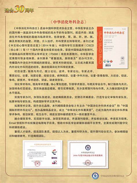 《中华消化外科杂志》(月刊)创刊于2002年,是由中国科学技术协会主管、中华医学会主办的国内惟一涵盖消化外科各领域的高水平专业期刊。为中国科技论文统计源期刊、中国自然科学类核心期刊;已被中国科学引文数据库(CSCD)、中国学术期刊综合评价数据库(CAJCED)、中文生物医学期刊文献数据库(CMCC)、中国生物医学期刊引文数据库(CMCI)、万方数字化期刊群、美国《化学文摘》(CA)、美国《乌利希国际期刊指南》(Ulrich IPD)、美国《剑桥科学文摘》(CSA)、波兰《哥白尼索引》(IC)、英国《国际农业与生物科学研究中心》(CABI)、世界卫生组织西太平洋地区医学索引(WPRIM)等收录。《中华消化外科杂志》办刊宗旨:传播国内外消化外科领域的新理论、新技术和新经验,立志成为联系国内外消化外科同道的纽带,推动我国消化外科学的发展。办刊方针:着重提高,兼顾普及。报道内容:涵盖消化外科各领域的基础与临床研究,包括食管、胃、肠、肝、胆、胰、脾及其相关的血管、内镜、介入治疗、外科营养支持等研究。栏目设置:专家论坛、述评、论著、短篇论著、今日外科、外科天地、影像集锦、病例报道、经验交流、大巡诊、会议纪要、综述、讲座、医学见闻、国外名家讲坛(译为中文)、读者来信等。