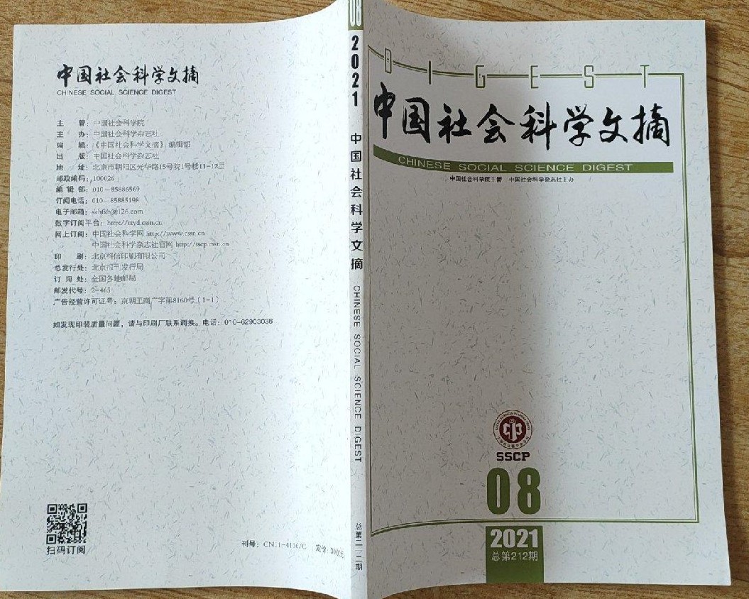 《中国社会科学文摘》是择优推介人文社会科学重要研究成果的文摘类期刊,其学术背景深厚,涵盖范围广泛。它强调学术品位,突出问题意识,倡导理论创新,兼及新知趣味。为开拓人文社会科学研究的新境界,扩大高水平研究成果的影响,它力求综合反映对重大现实问题和理论问题有深刻见解的学术成果,敏锐追踪对社会科学研究具有引导作用的前沿课题和热点问题,积极关注基于科学批判精神并在学术层面展开的争鸣与评论,精心提炼对学科建设和学术发展有所创新有所突破的论著精华。在广泛收集、严格筛选和着意梳理信息的基础上,它已形成集学术性、前瞻性、批判性、对策性为有机整体的办刊风格。