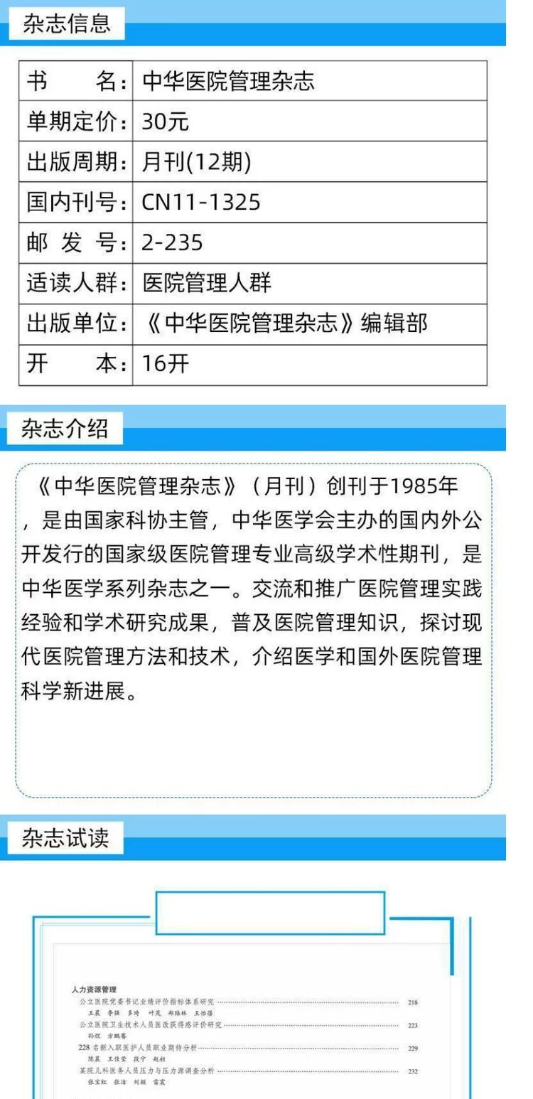 《中华医院管理杂志》(月刊)创刊于1985年,是由国家科协主管,中华医学会主办的国内外公开发行的国家级医院管理专业高级学术性期刊,是中华医学系列杂志之一,本刊主要设有专题研究、医疗质量、医院改革、科室管理、护理管理、科研管理、财务管理、计算机应用、学科进展、法规建设、医院感染管理、门、急诊管理、医疗缺陷管理、医疗制度改革、经济管理、戒毒医疗管理、药剂管理、设备管理、疗养院管理、基层卫生机构、城市卫生支农、建筑管理、后勤管理、人才管理、继续教育、医院文化、国外医院管理等60余个栏目。2007年中华医学会与万方数据携手推动医药信息服务,该刊电子版已独家授权万方数据来实现其数字化服务推广。