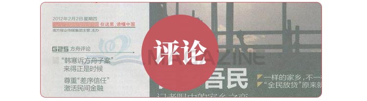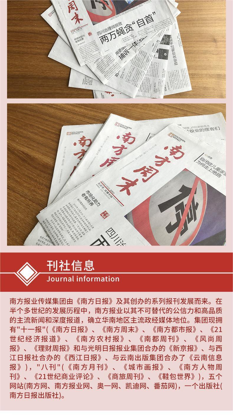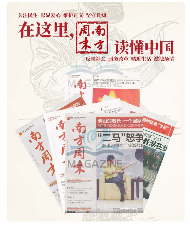 《南方周末》,作为“报纸改革的试验田”,无论版式,还是内容,《南方周末》都引领过报纸改革的潮流,是先着枝头的春花。已经形成新闻、文化、生活三大板块的办报格局,新闻以独家为主,时评以纵深见长,副刊则佳作迭现。凝结老中青三代报人的心血,承载数百万读者的厚望,《南方周末》正在为振兴报业集团而努力。