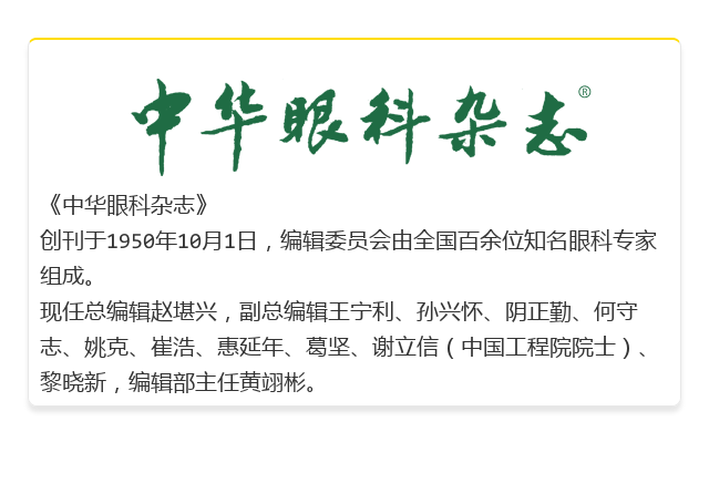 《中华眼科杂志》(月刊)创刊于1950年,为中华医学会主办的眼科专业性学术期刊。《中华眼科杂志》以广大眼科医师为主要读者对象,报道眼科领域内领先的科研成果和临床诊疗经验,以及对眼科临床有指导作用、且与眼科临床密切结合的基础理论研究。本刊的办刊宗旨:贯彻党和国家对卫生工作的方针政策,贯彻理论与实践、普及与提高相结合的办刊方针,反映我国眼科临床和科研工作的重大进展,促进国内外眼科学术交流。《中华眼科杂志》被北大1992版核心期刊、北大1996版核心期刊、北大2000版核心期刊、北大2004版核心期刊、北大2008版核心期刊,国立医学图书馆生物医学检索系统收录。获得1996年荣获中国科协第二届全国优秀学术期刊二等奖。