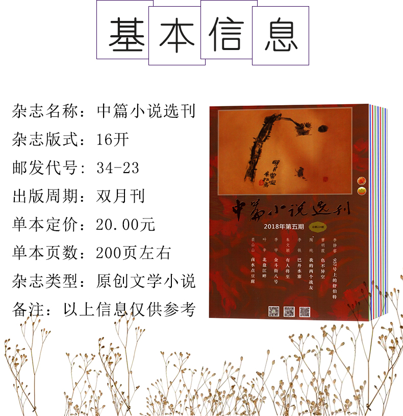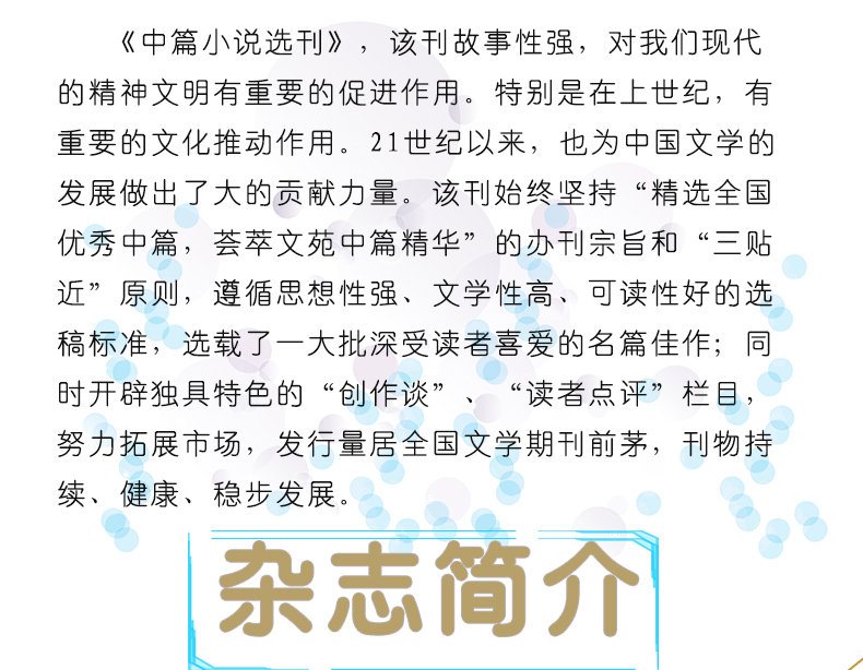 《中篇小说选刊》创刊于1981年6月,始终坚持“精选全国优秀中篇,荟萃文苑中篇精华”的办刊宗旨和“三贴近”原则,遵循思想性强、文学性高、可读性好的选稿标准,选载了一大批深受读者喜爱的名篇佳作;同时开辟独具特色的“创作谈”、“读者点评”栏目,努力拓展市场,发行量居全国文学期刊前茅,刊物持续、健康、稳步发展。《中篇小说选刊》先后被评为全国百种重点社科期刊、中国期刊方阵双百期刊,荣获第二届国家期刊奖提名奖,在全国享有较高的知名度和影响力,已成为展示中国当代中篇小说创作成就的名牌期刊。
