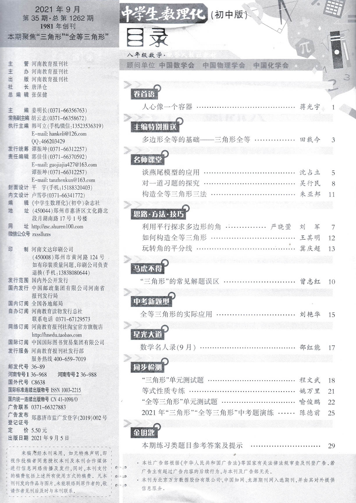 《中学生数理化》创刊于1981年10月,刊名由著名数学家华罗庚题写,吴文俊、陈景润、钱三强、苏步青、周光召、钱伟长、白春礼等50多位院士为本刊撰文或题词。世界著名物理学家、诺贝尔奖获得者李政道先生为本刊题词:“学好数理化,一生能创新”。《中学生数理化》一贯坚持以为素质教育服务、帮助中学生打好数理化基础为宗旨,以打造权威、经典、实用的精品报刊为原则,努力体现“贴近课堂教学实际,贴近学生学习和生活实际”的特点,精心创造“让老师省心、家长放心、学生开心”的精神食粮,融知识性、科学性、趣味性、新颖性、实用性于一体,深受老师和学生喜爱。《中学生数理化》为配合素质教育,培养学生的参与意识和表现欲,各年级版每期都举办了丰富多彩的竞赛活动,如数学潜能知识竞赛、数学系列知识竞赛等。知识就是力量,参与就是胜利。