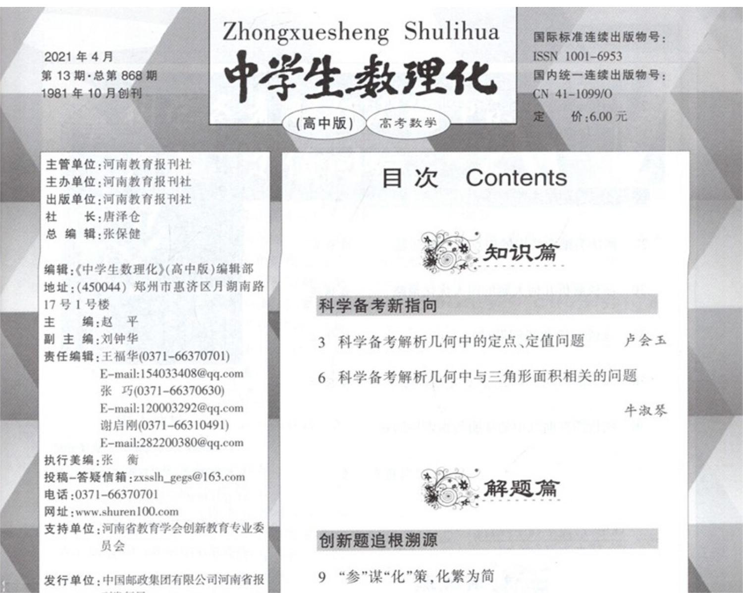 《中学生数理化》一贯坚持以为素质教育服务、帮助中学生打好数理化基础为宗旨,以打造权威、经典、实用的精品报刊为原则,努力体现“贴近课堂教学实际,贴近学生学习和生活实际”的特点,精心创造“让老师省心、家长放心、学生开心”的精神食粮,融知识性、科学性、趣味性、新颖性、实用性于一体,深受老师和学生喜爱。《中学生数理化》曾蝉联两届全国优秀科技期刊奖和六届河南省优秀科技期刊奖,2007年获得了第三届中国优秀少儿报刊奖金奖,2008年荣获河南省第一届自然科学“二十佳”期刊称号。《中学生数理化》高中各年级版,以全程备考理论为指导,坚持从高考的角度,强化知识的梳理和方法的总结,透彻剖析考试重点,准确分析高考趋势,全面把握考试信息,能培养学生全程备考的学习理念,使学生掌握全程备考的实战方略。《中学生数理化》为配合素质教育,培养学生的参与意识和表现欲,各年级版每期都举办了丰富多彩的竞赛活动,如数学潜能知识竞赛、数学系列知识竞赛等。知识就是力量,参与就是胜利。